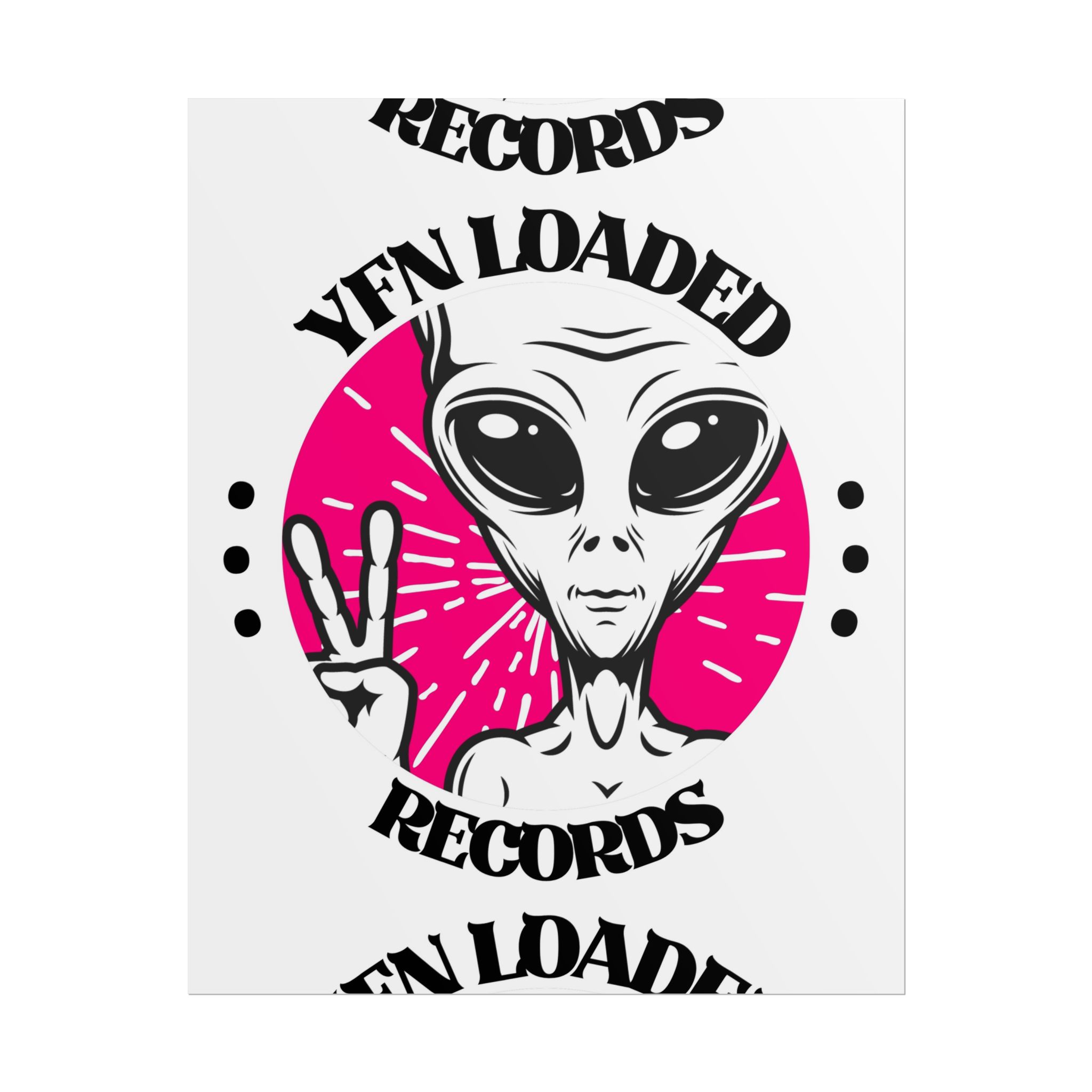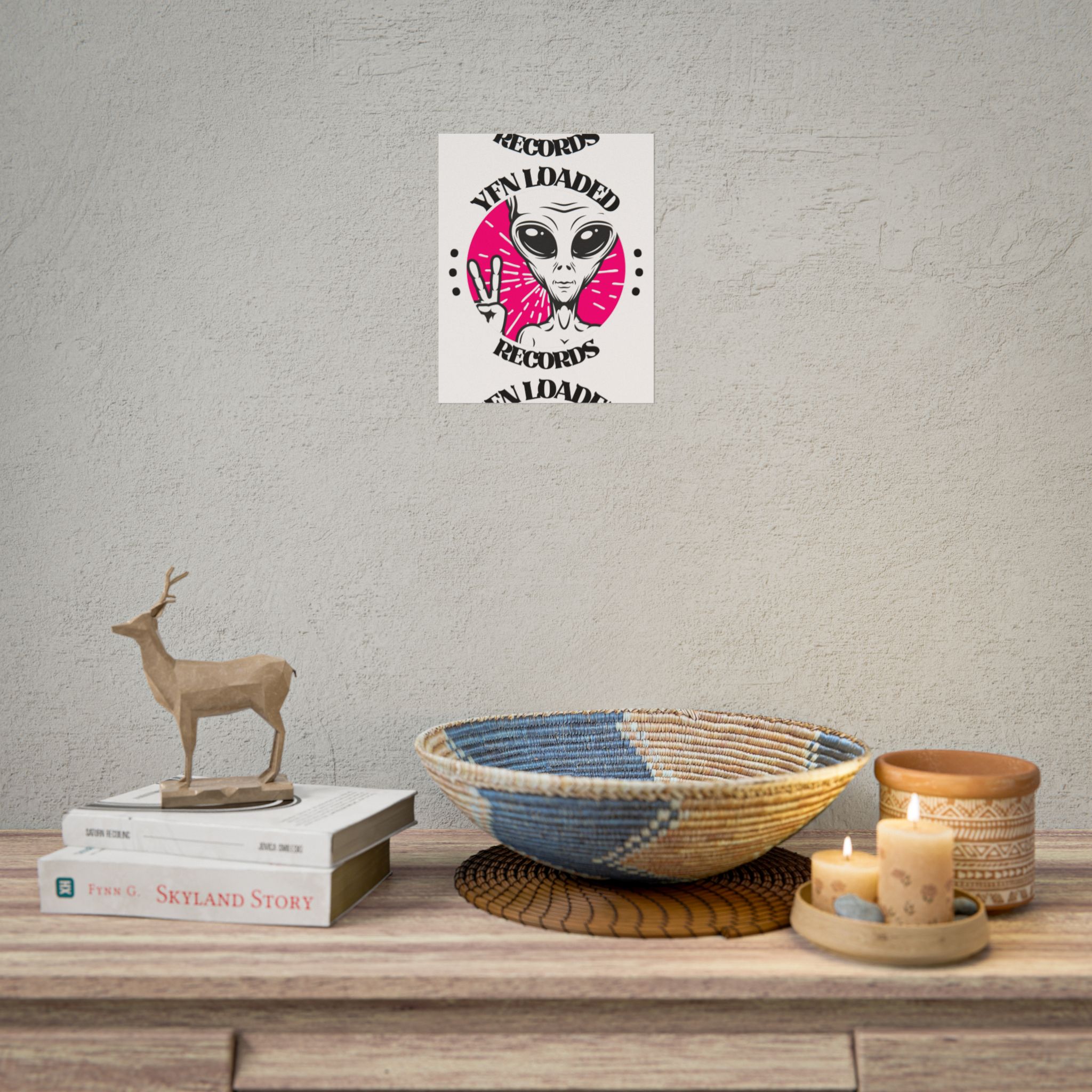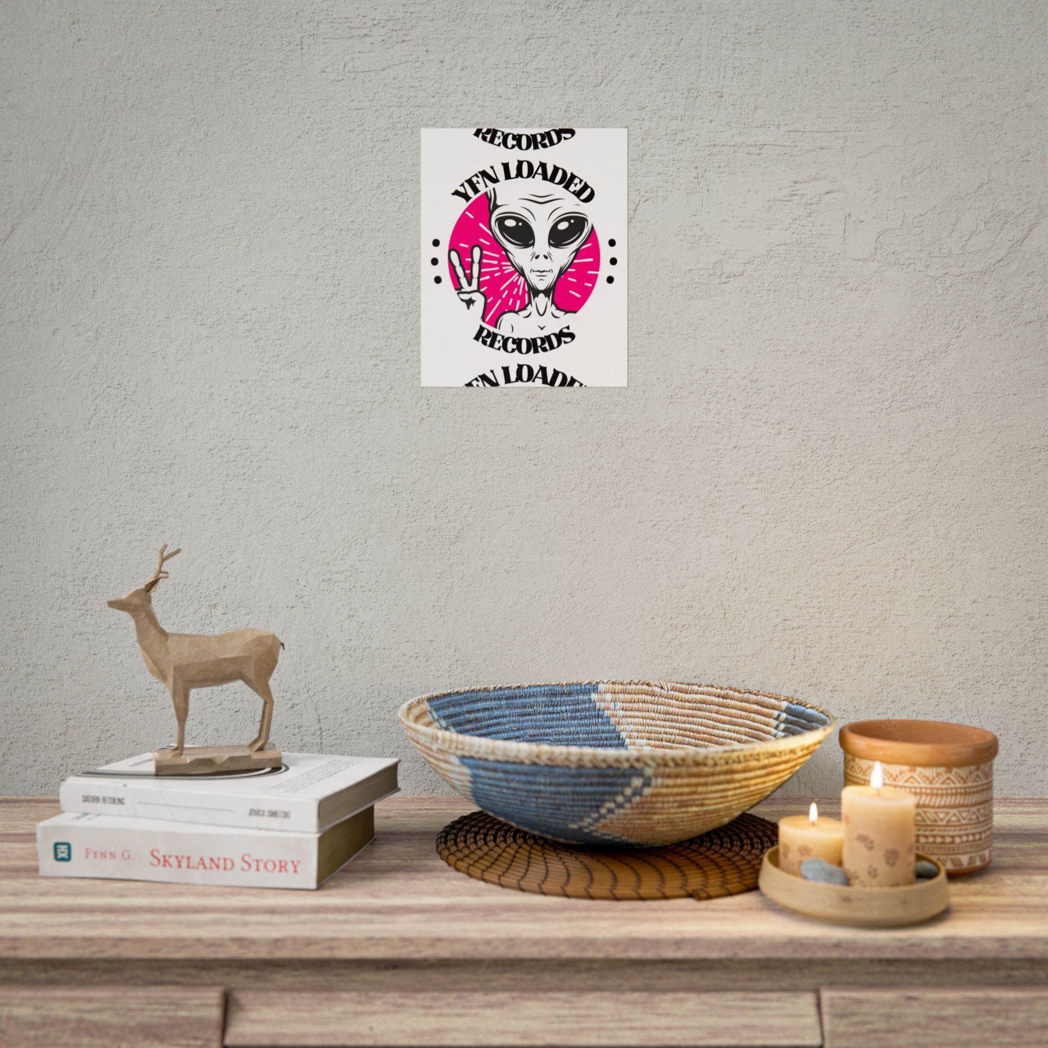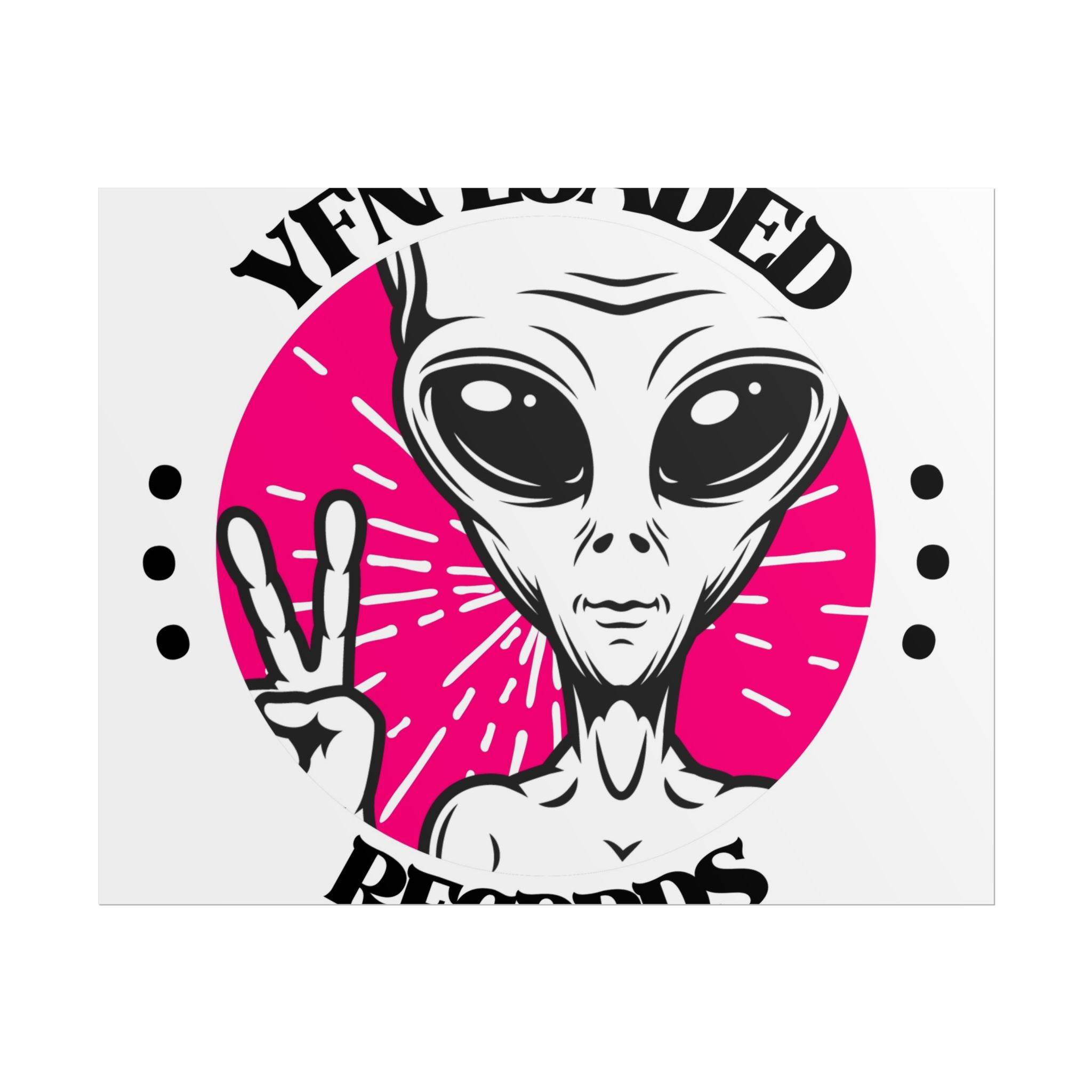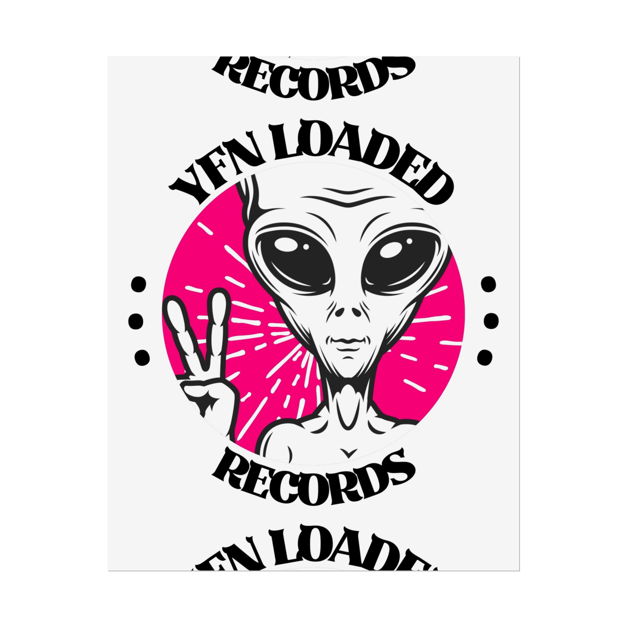 A bold rolled poster that brings playful extraterrestrial energy to any wall. Printed with archival giclée quality, this design features a stylized alien flashing a peace sign against a vivid magenta halo and retro type that reads “VFN LOADED RECORDS.” The textured fine art option adds depth and a handcrafted feel; semi-gloss delivers punchy, sharp color; matte offers a softer, museum-like finish. Rolled for safe shipping, these posters arrive ready to frame or pin up for instant personality in studios, dorm rooms, or listening corners.