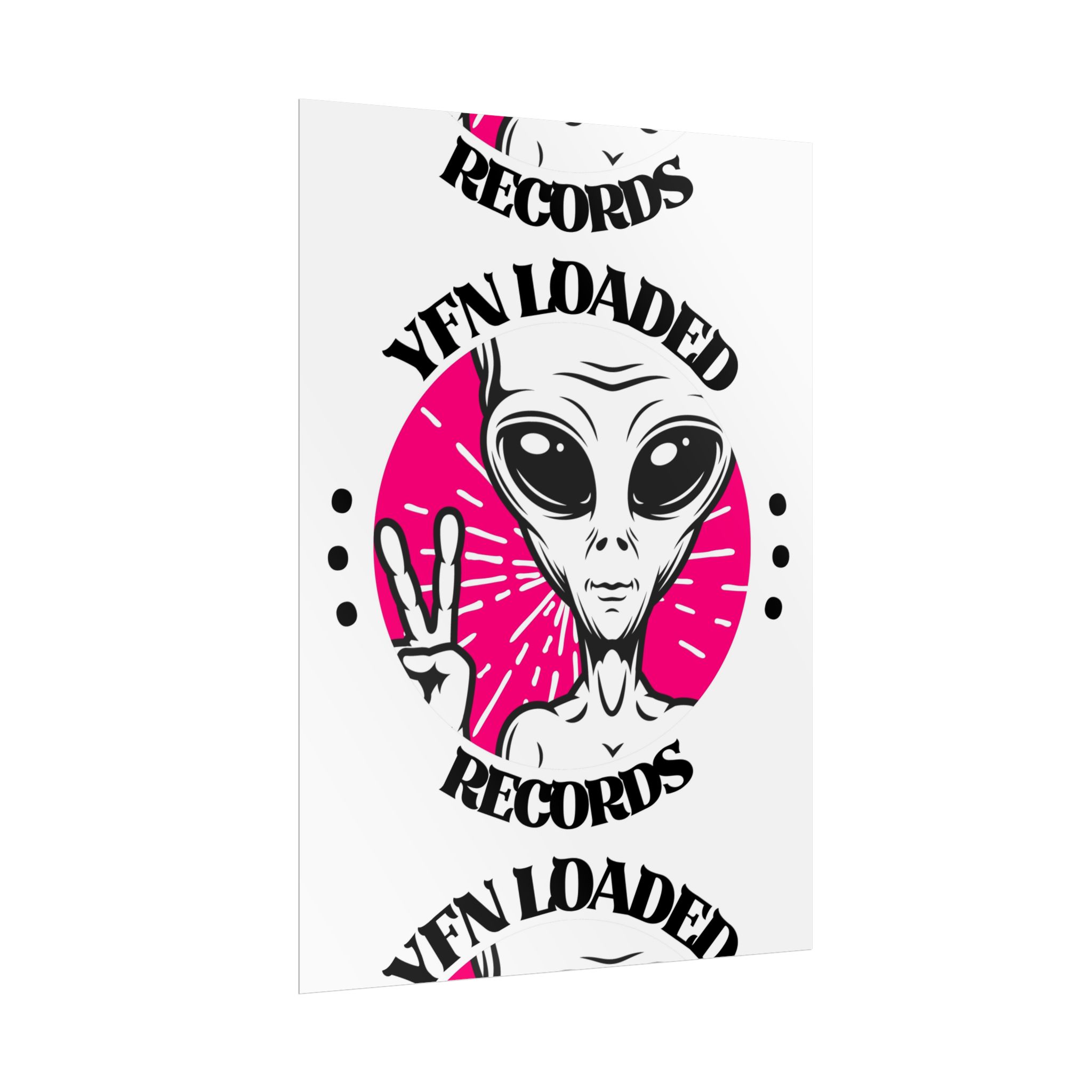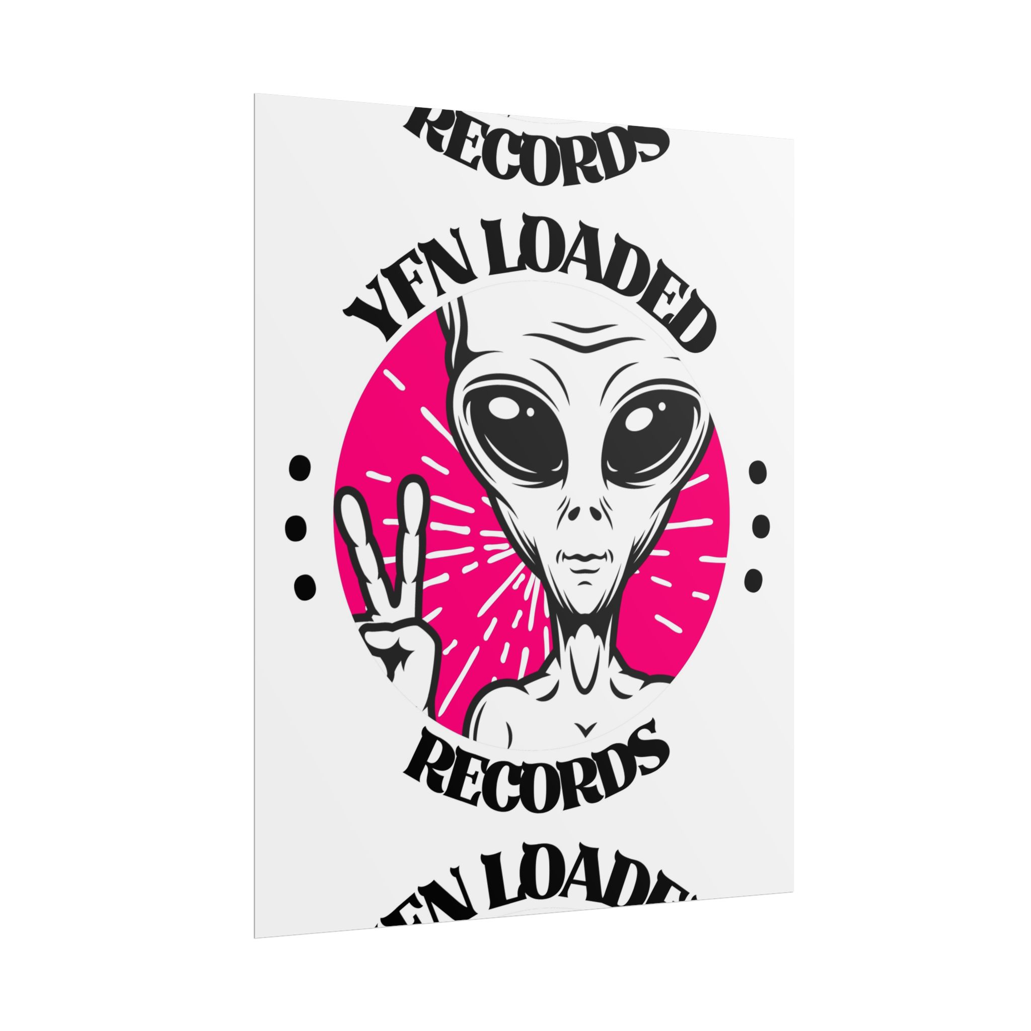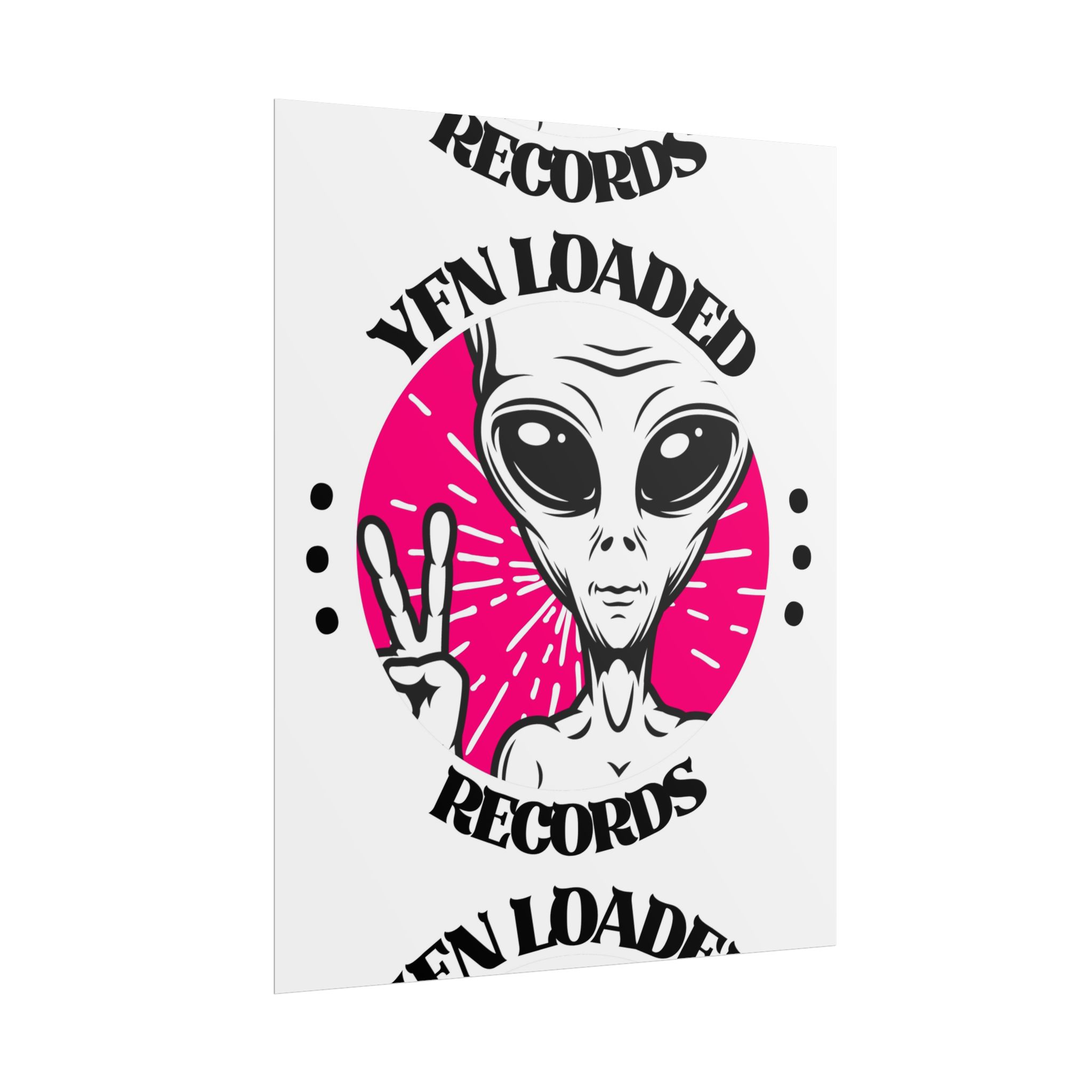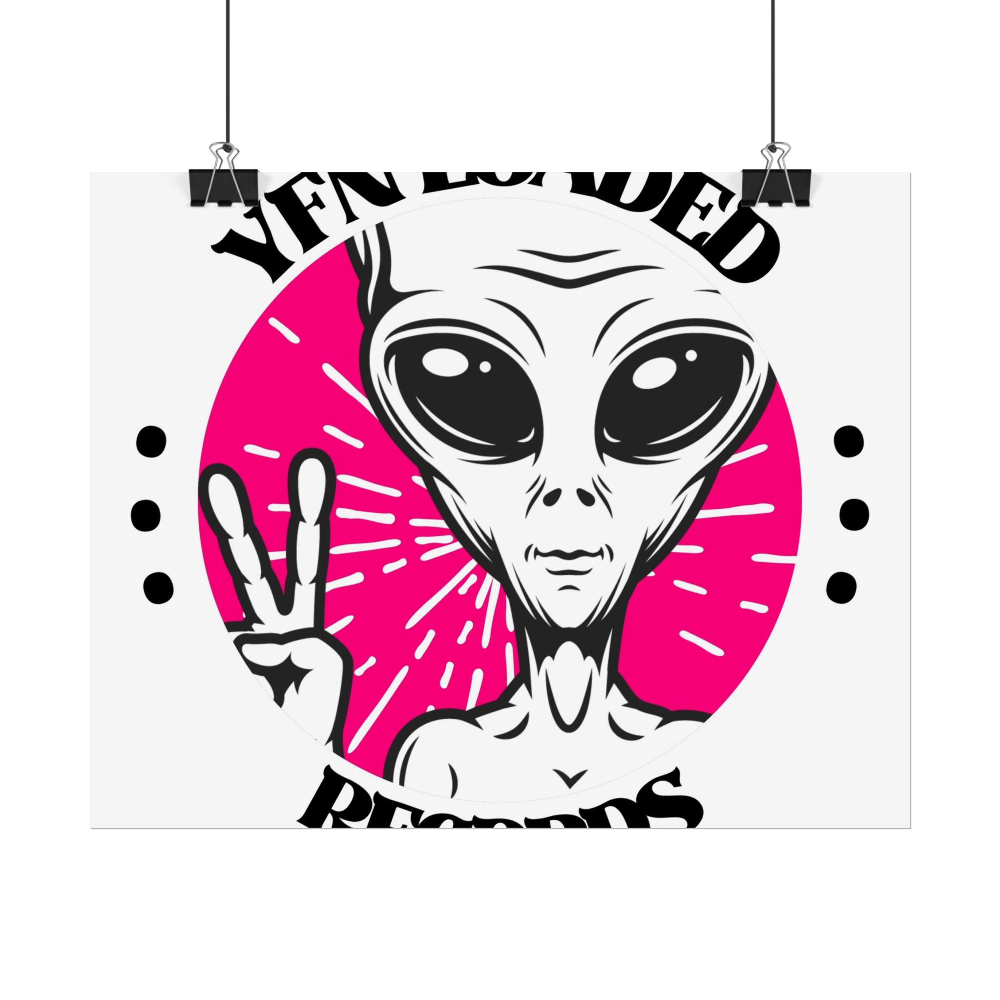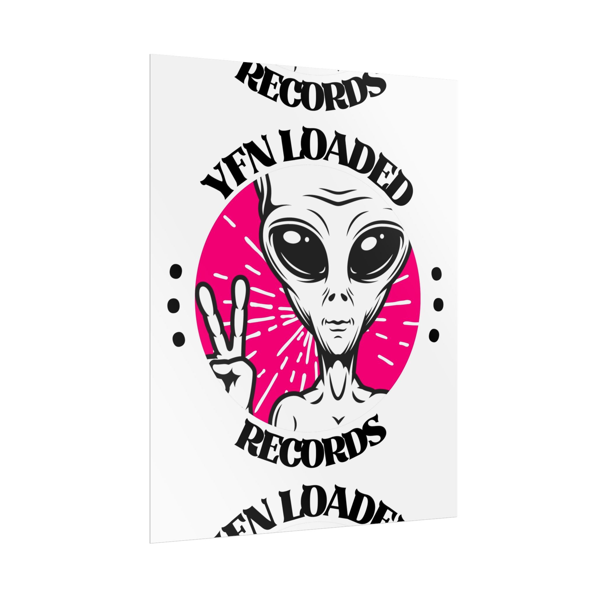 A bold rolled poster that brings playful extraterrestrial energy to any wall. Printed with archival giclée quality, this design features a stylized alien flashing a peace sign against a vivid magenta halo and retro type that reads “VFN LOADED RECORDS.” The textured fine art option adds depth and a handcrafted feel; semi-gloss delivers punchy, sharp color; matte offers a softer, museum-like finish. Rolled for safe shipping, these posters arrive ready to frame or pin up for instant personality in studios, dorm rooms, or listening corners.