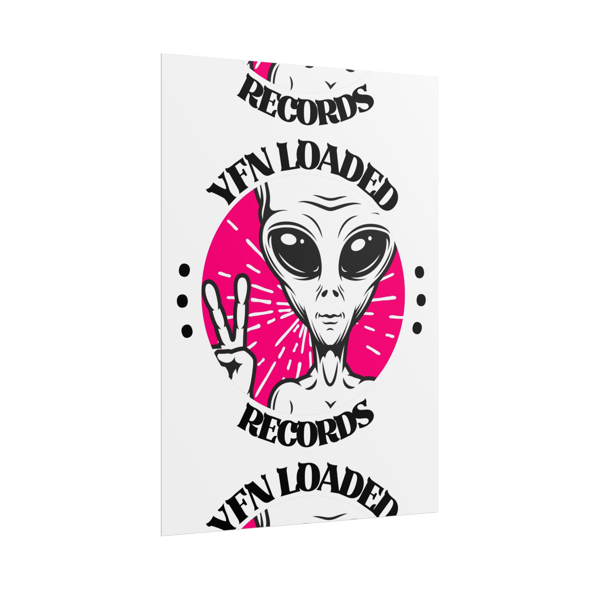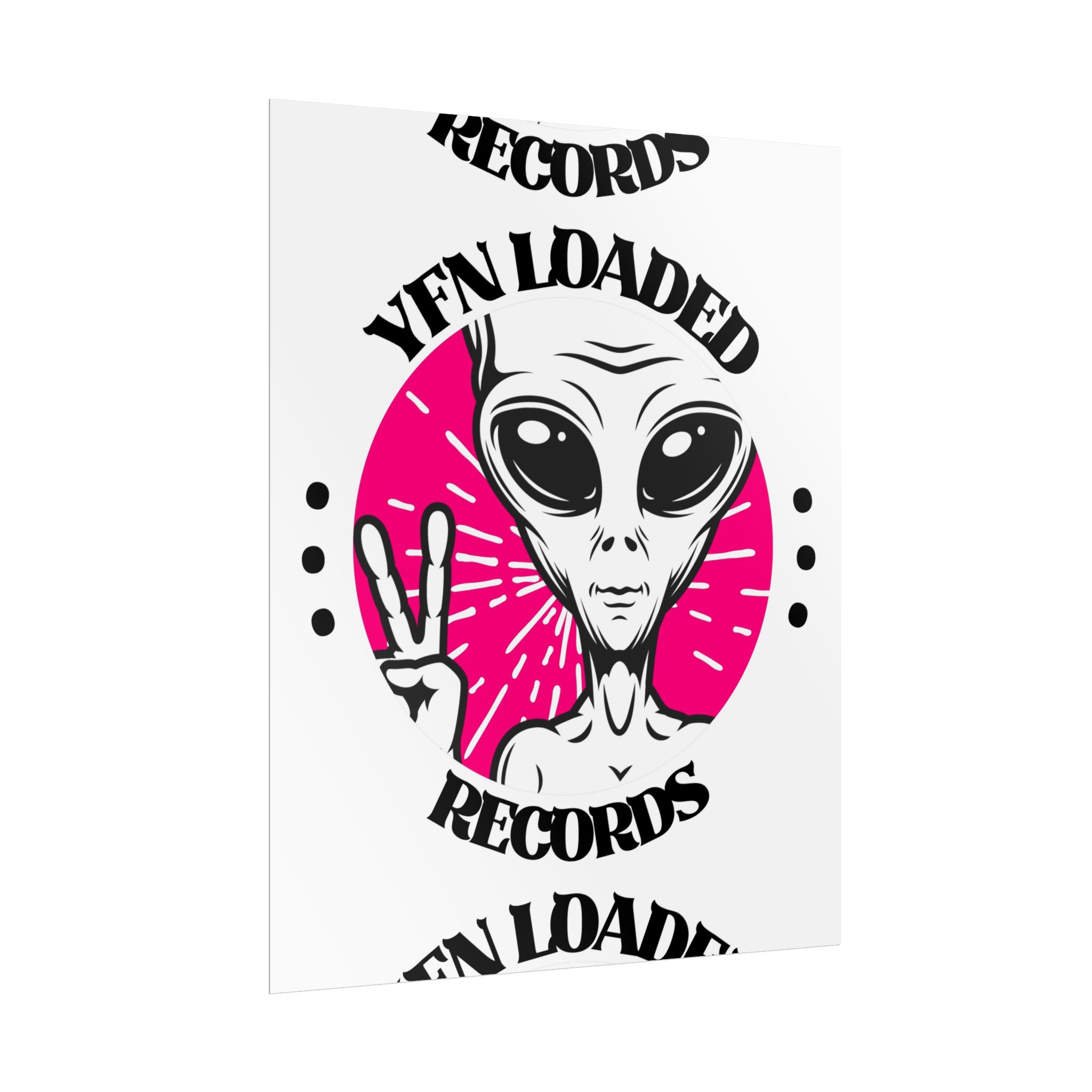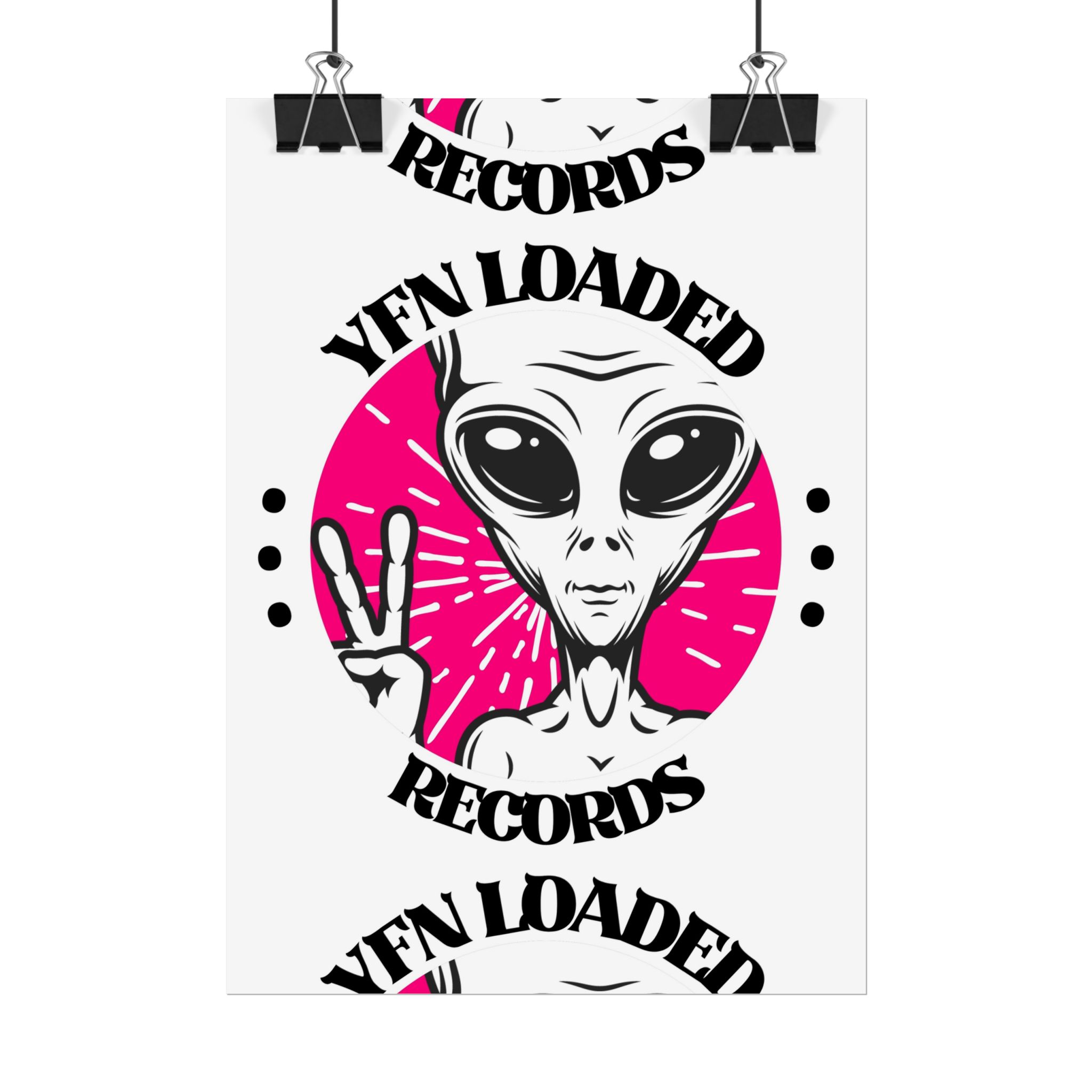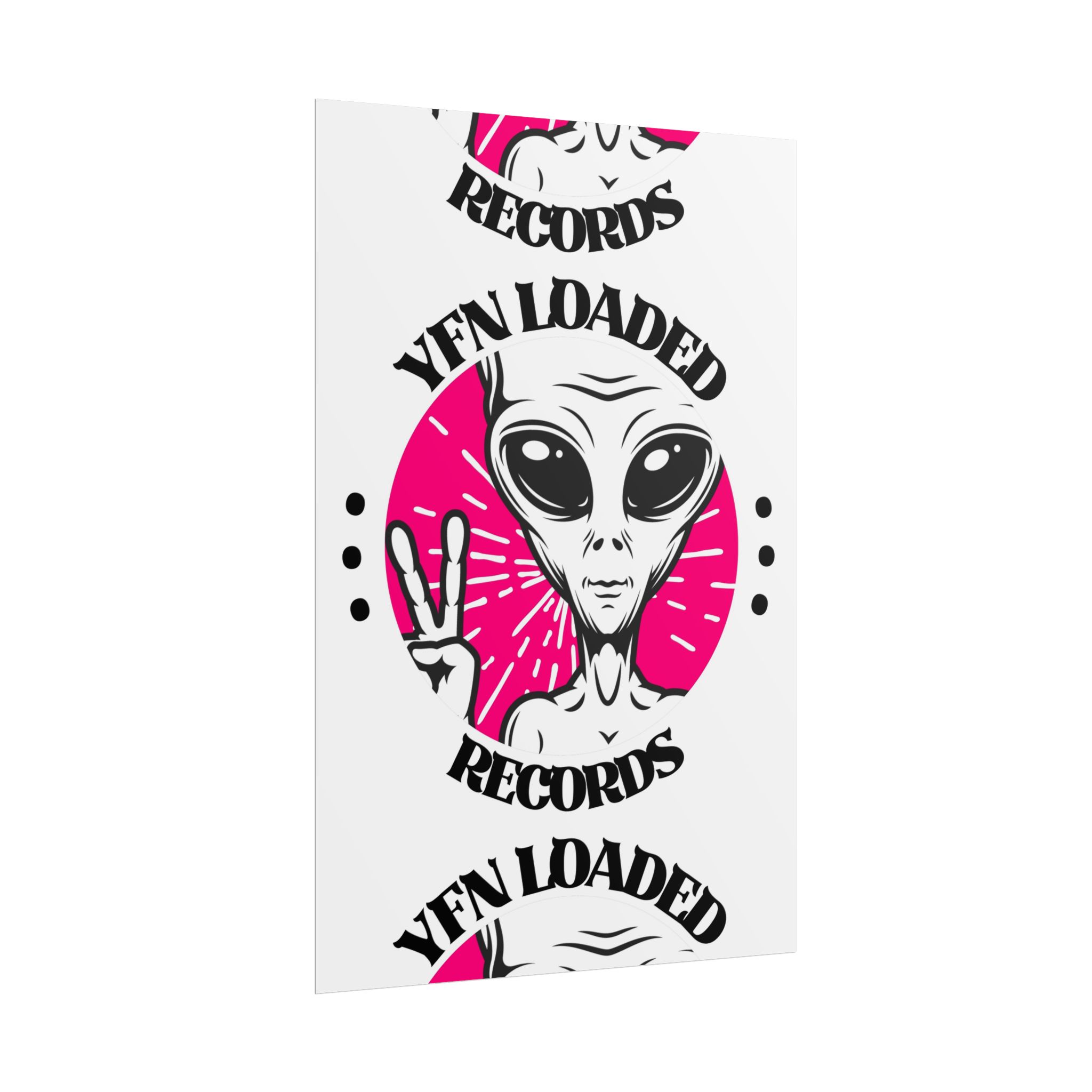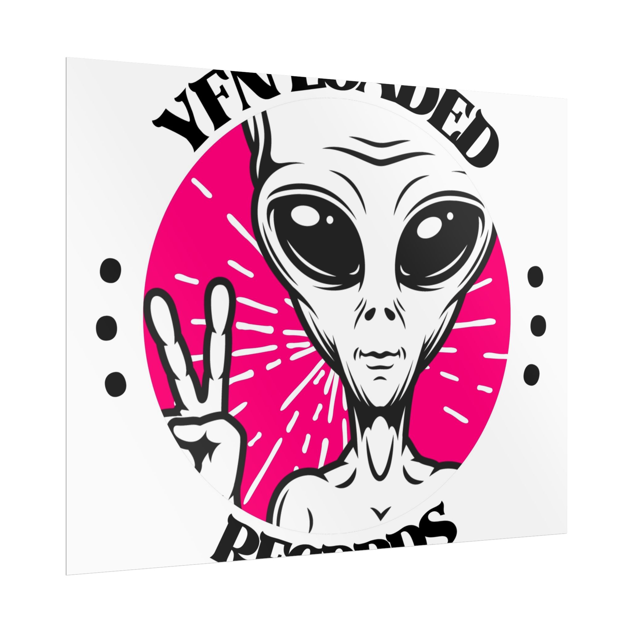 A bold rolled poster that brings playful extraterrestrial energy to any wall. Printed with archival giclée quality, this design features a stylized alien flashing a peace sign against a vivid magenta halo and retro type that reads “VFN LOADED RECORDS.” The textured fine art option adds depth and a handcrafted feel; semi-gloss delivers punchy, sharp color; matte offers a softer, museum-like finish. Rolled for safe shipping, these posters arrive ready to frame or pin up for instant personality in studios, dorm rooms, or listening corners.