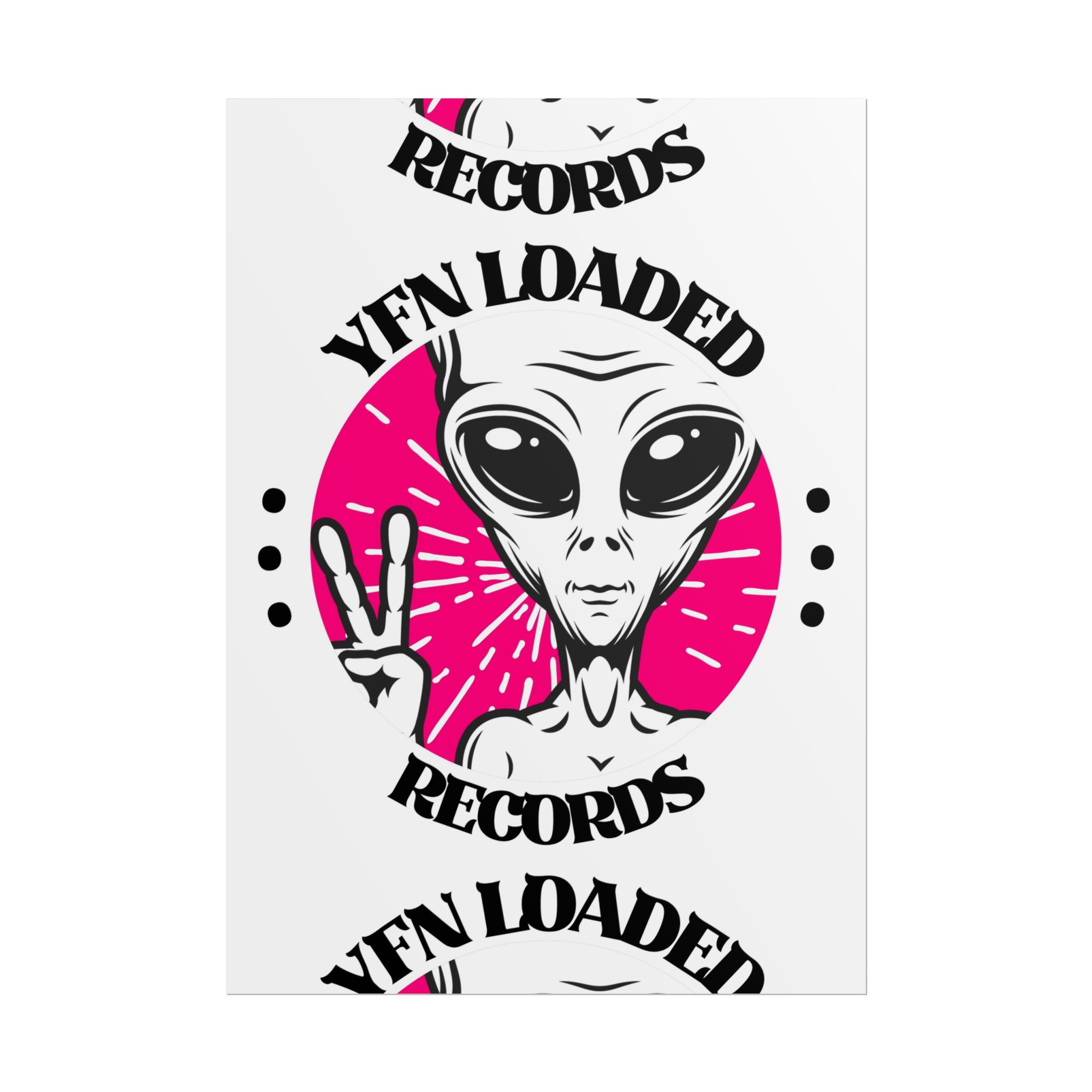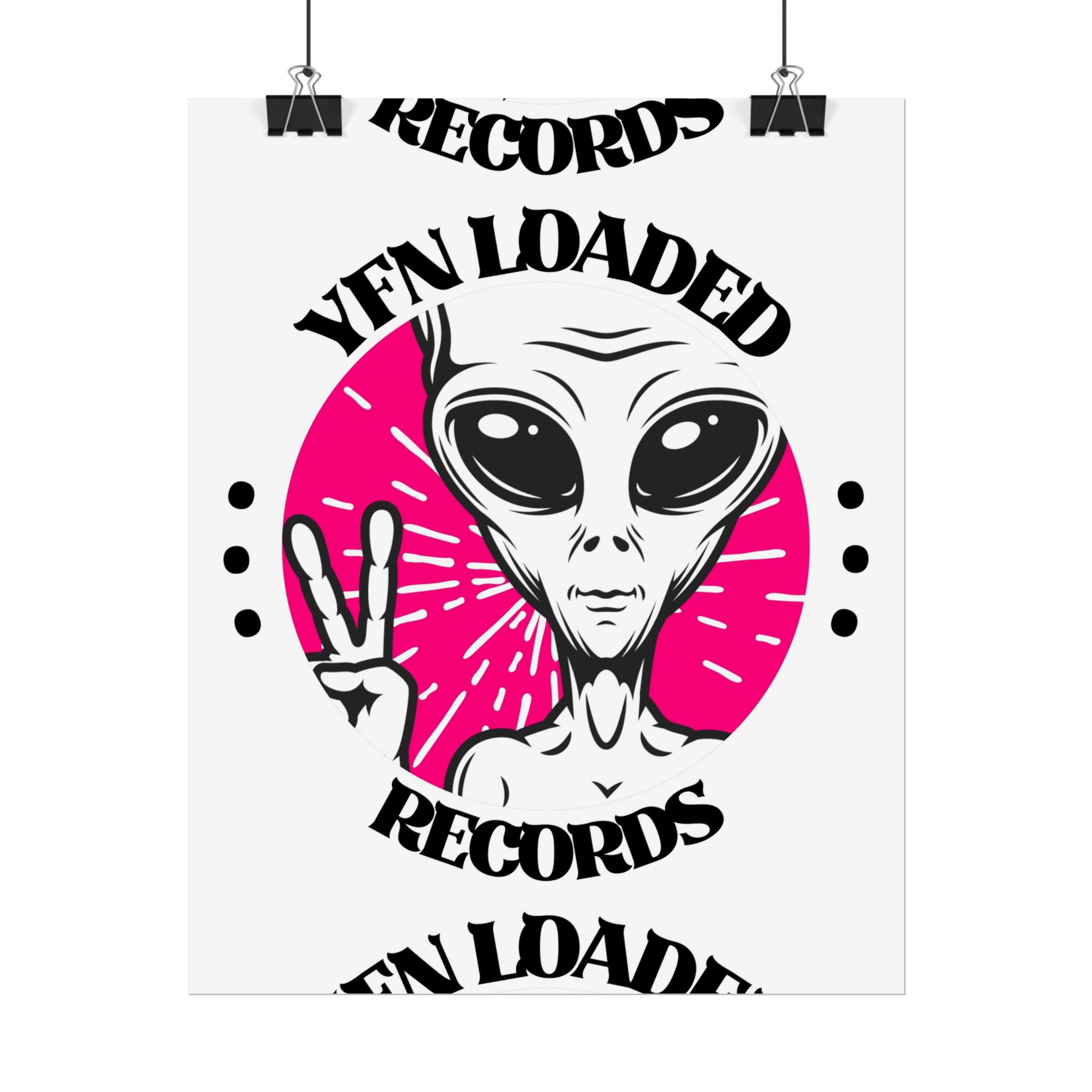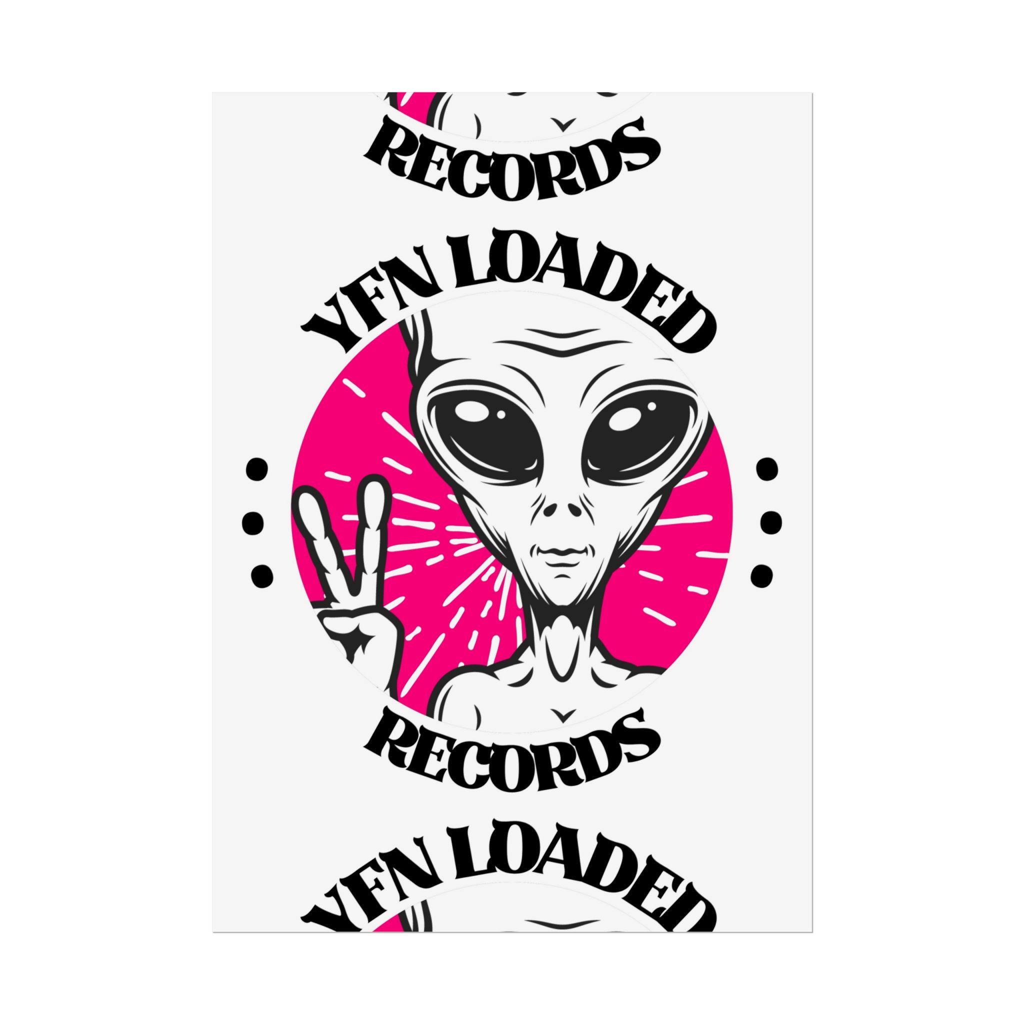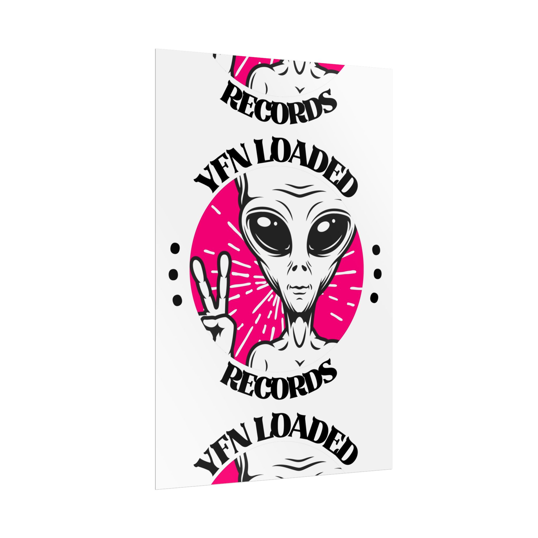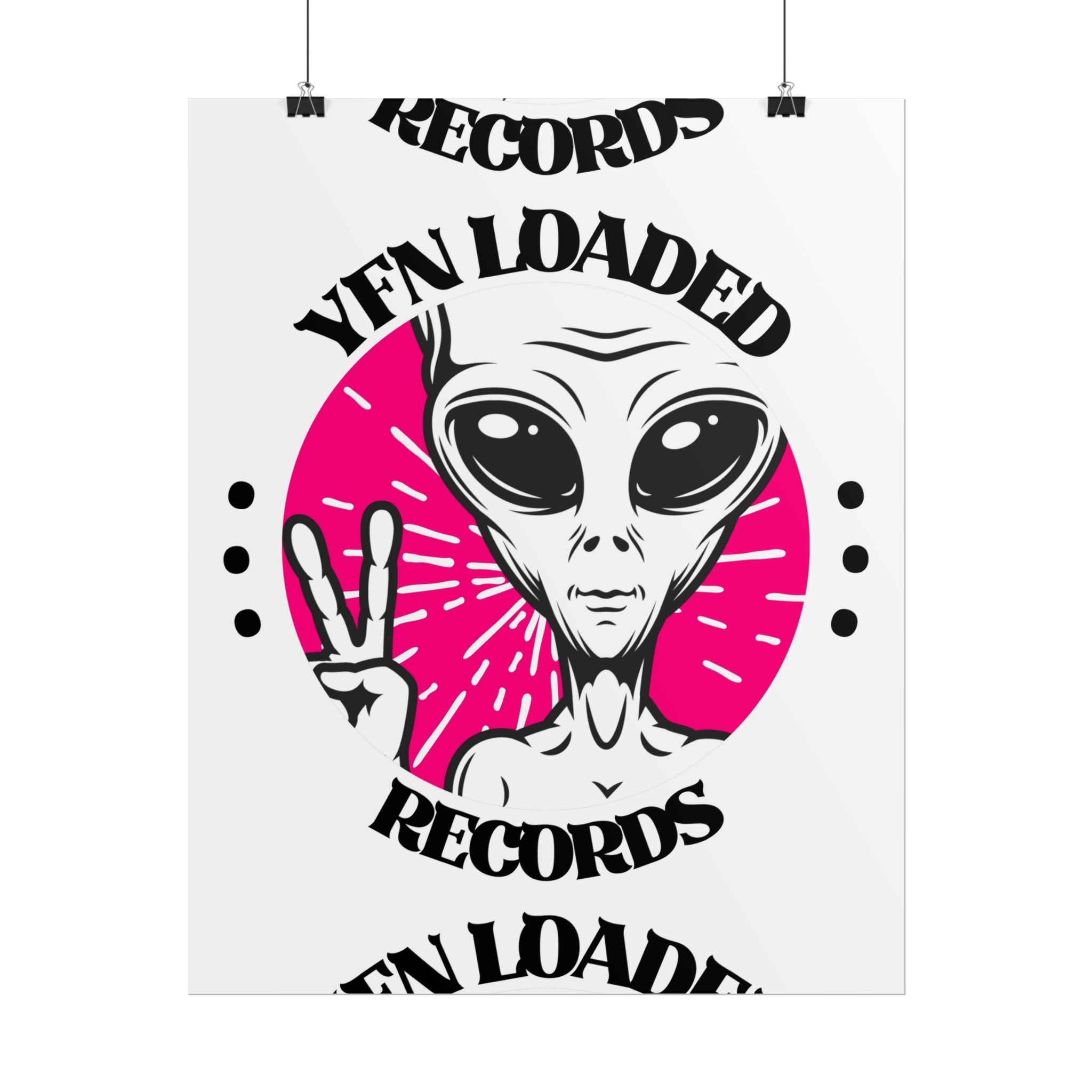 A bold rolled poster that brings playful extraterrestrial energy to any wall. Printed with archival giclée quality, this design features a stylized alien flashing a peace sign against a vivid magenta halo and retro type that reads “VFN LOADED RECORDS.” The textured fine art option adds depth and a handcrafted feel; semi-gloss delivers punchy, sharp color; matte offers a softer, museum-like finish. Rolled for safe shipping, these posters arrive ready to frame or pin up for instant personality in studios, dorm rooms, or listening corners.