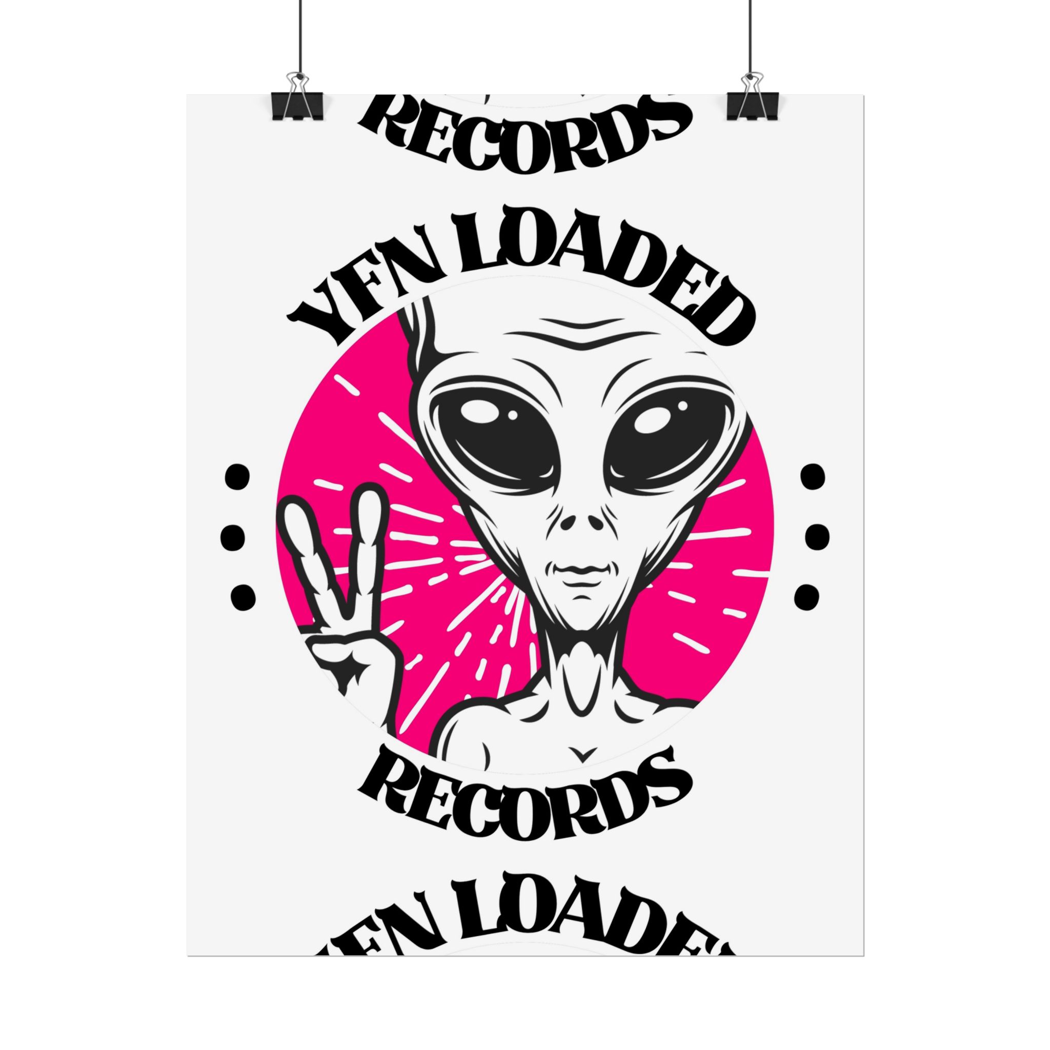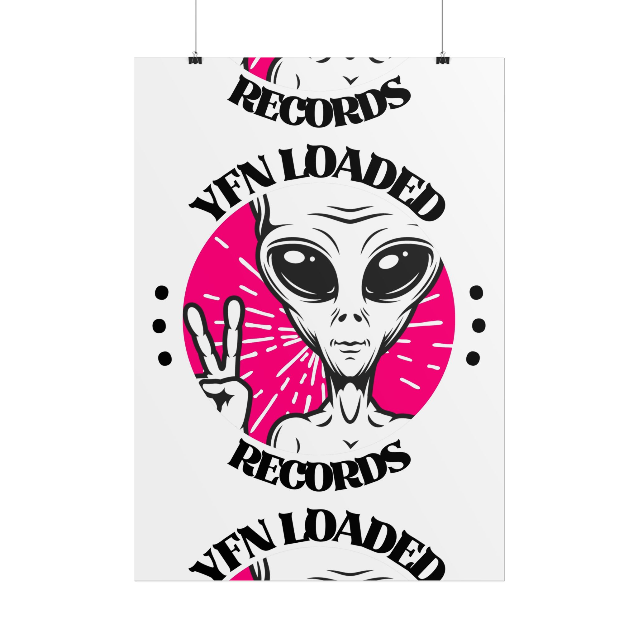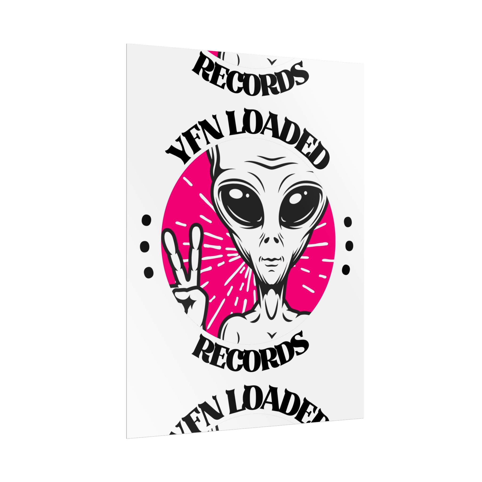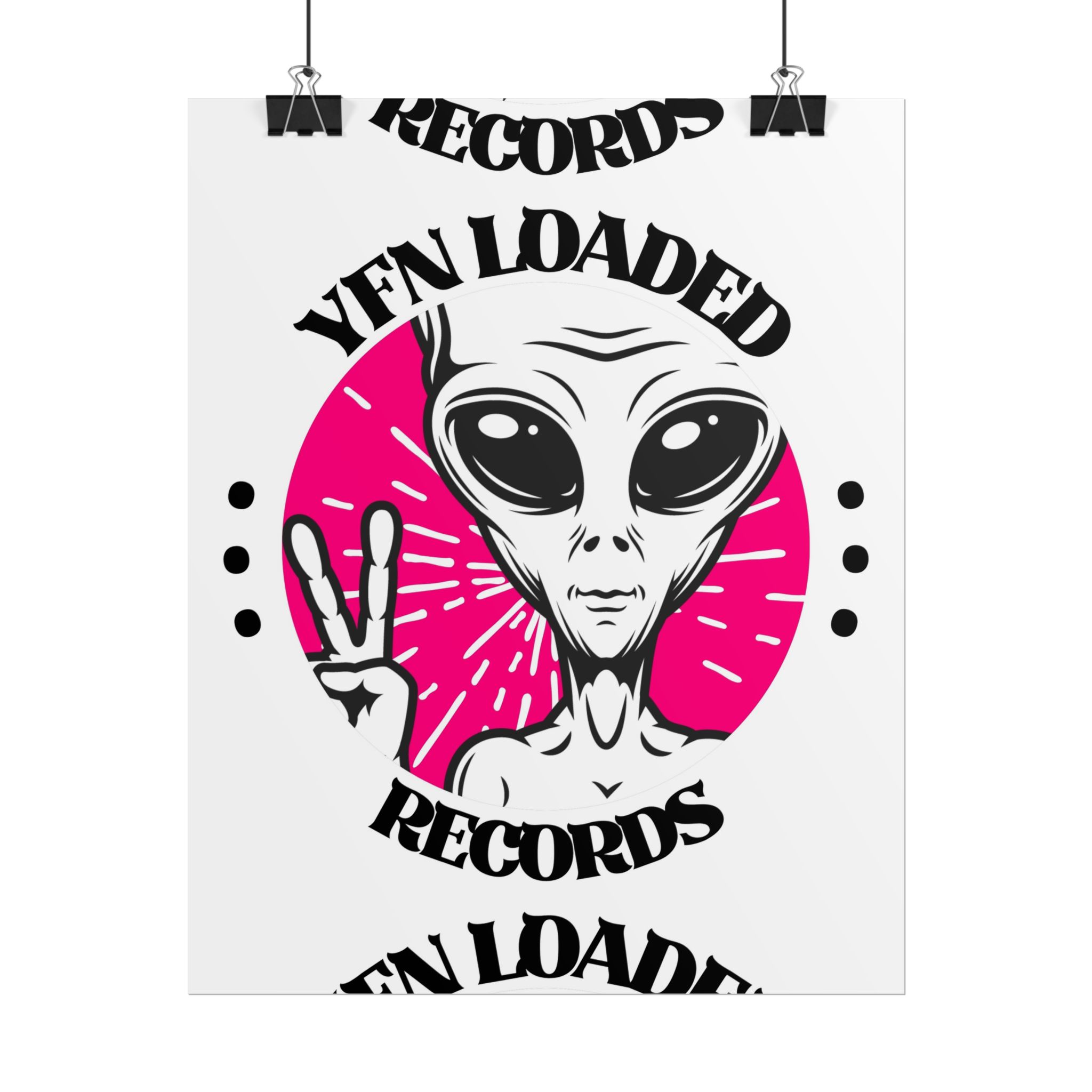 A bold rolled poster that brings playful extraterrestrial energy to any wall. Printed with archival giclée quality, this design features a stylized alien flashing a peace sign against a vivid magenta halo and retro type that reads “VFN LOADED RECORDS.” The textured fine art option adds depth and a handcrafted feel; semi-gloss delivers punchy, sharp color; matte offers a softer, museum-like finish. Rolled for safe shipping, these posters arrive ready to frame or pin up for instant personality in studios, dorm rooms, or listening corners.