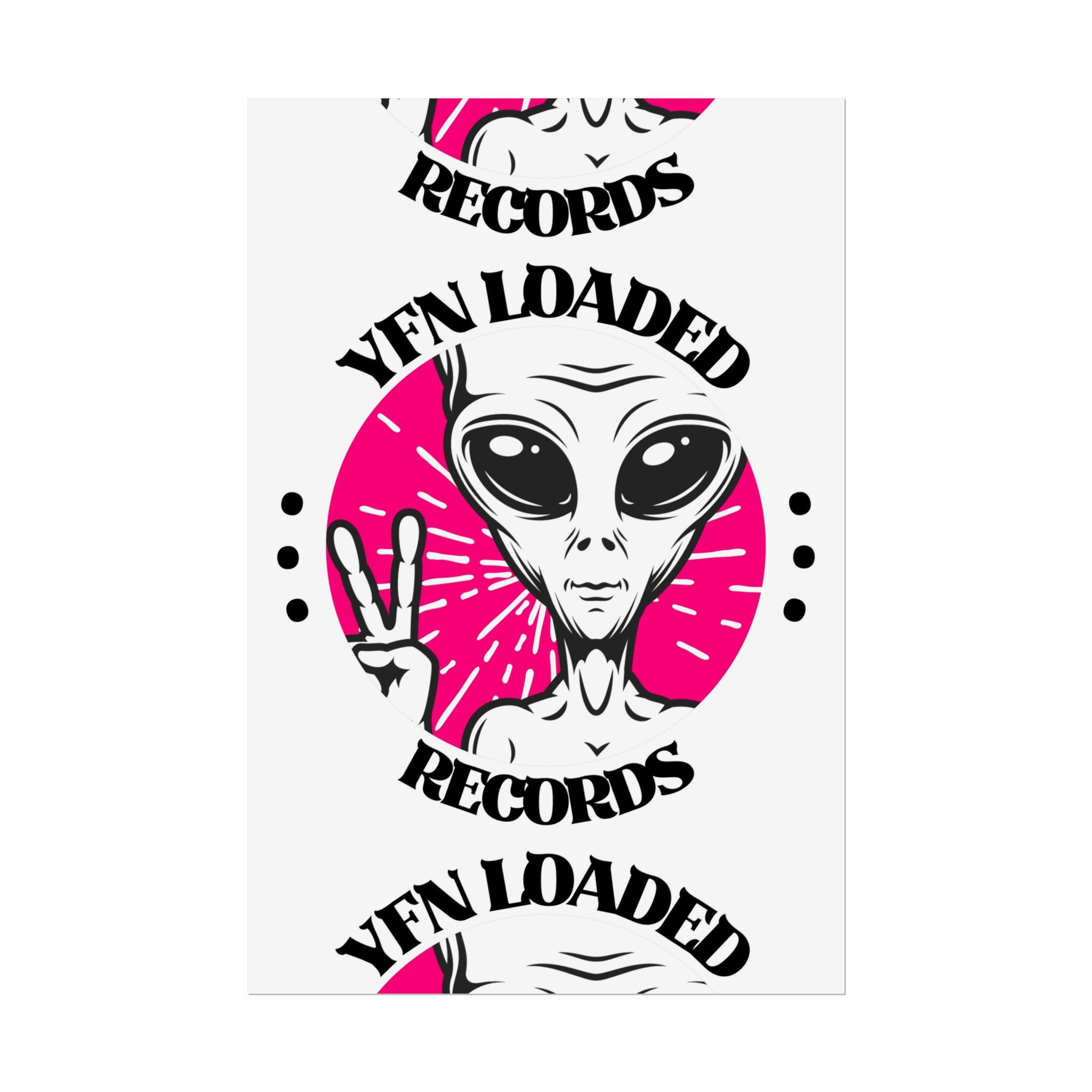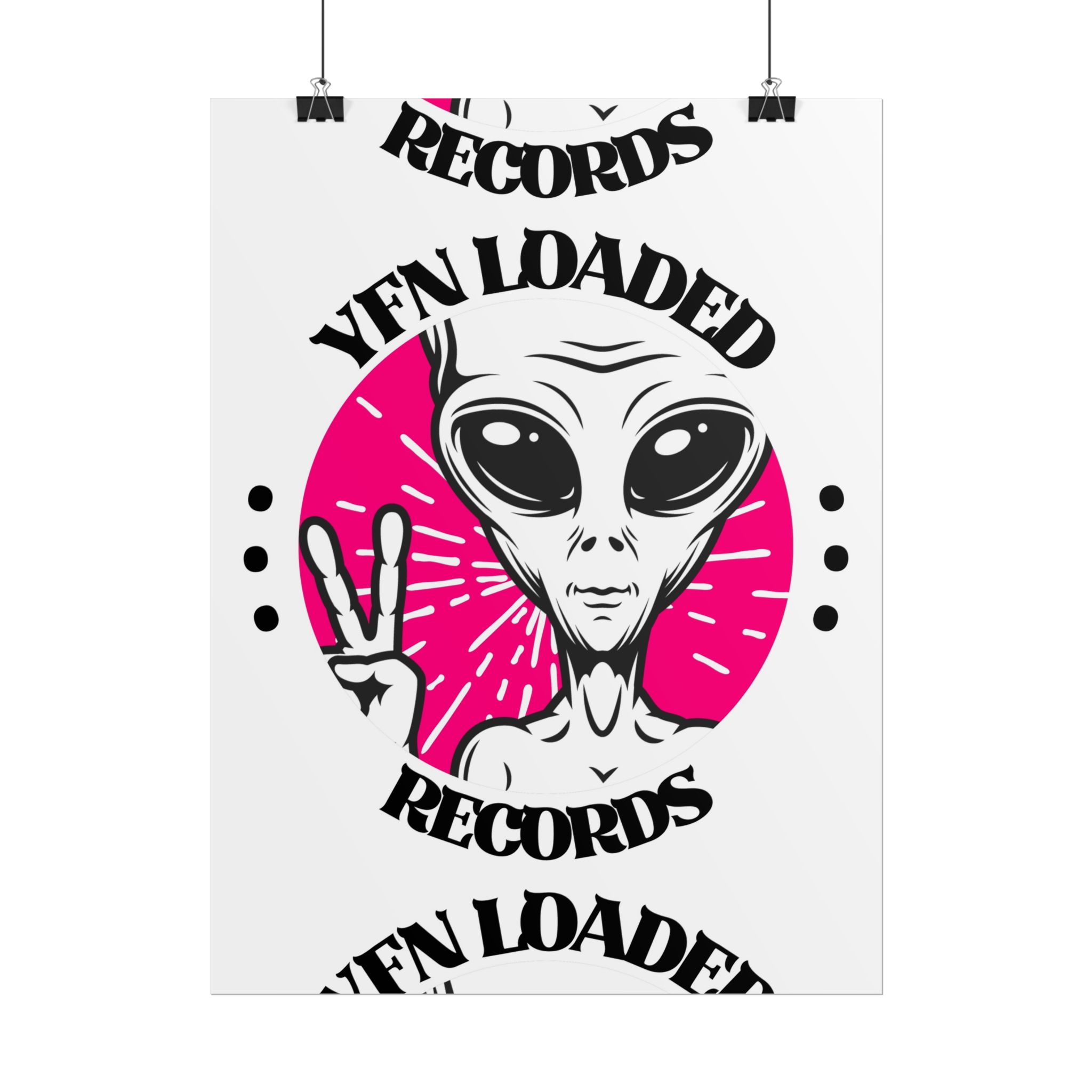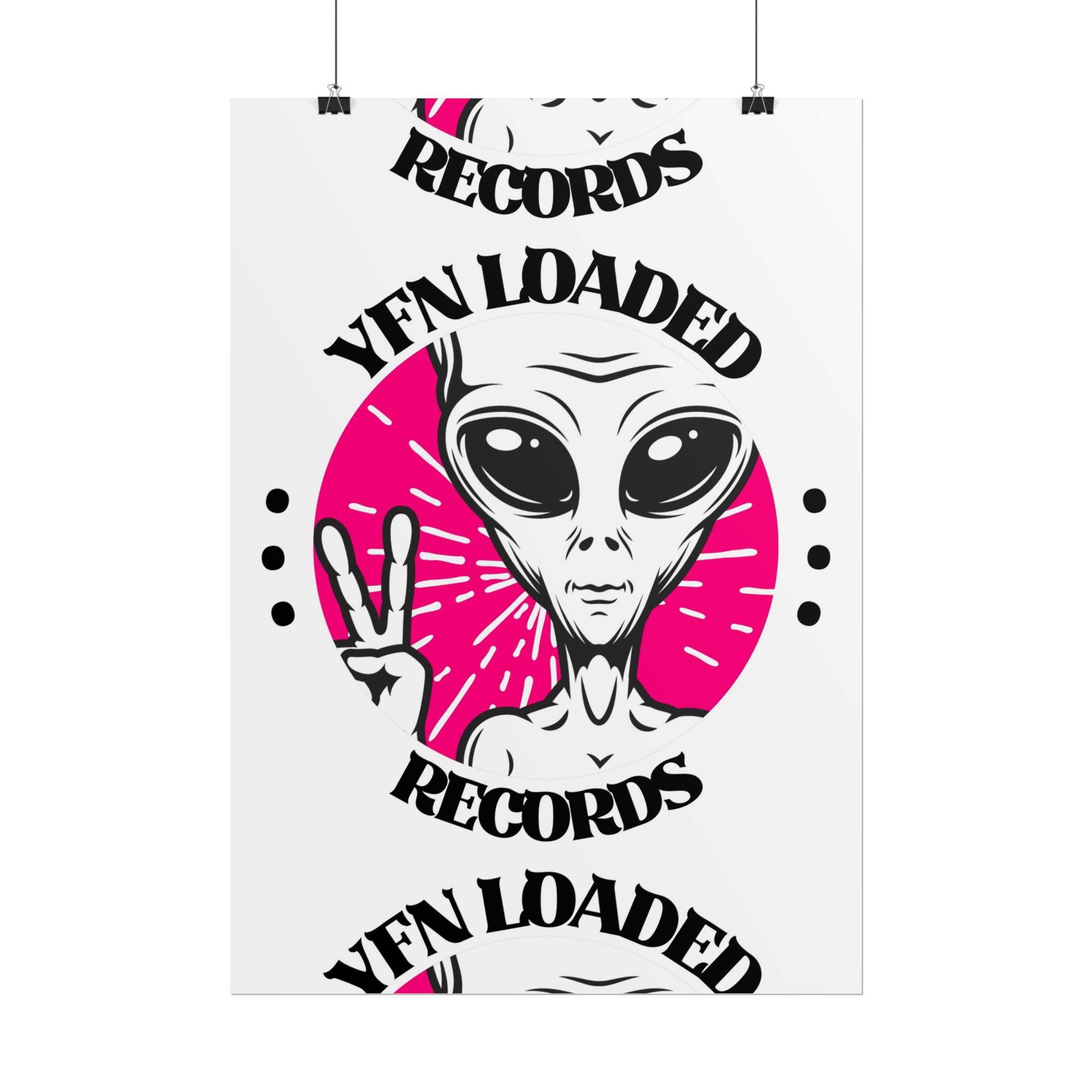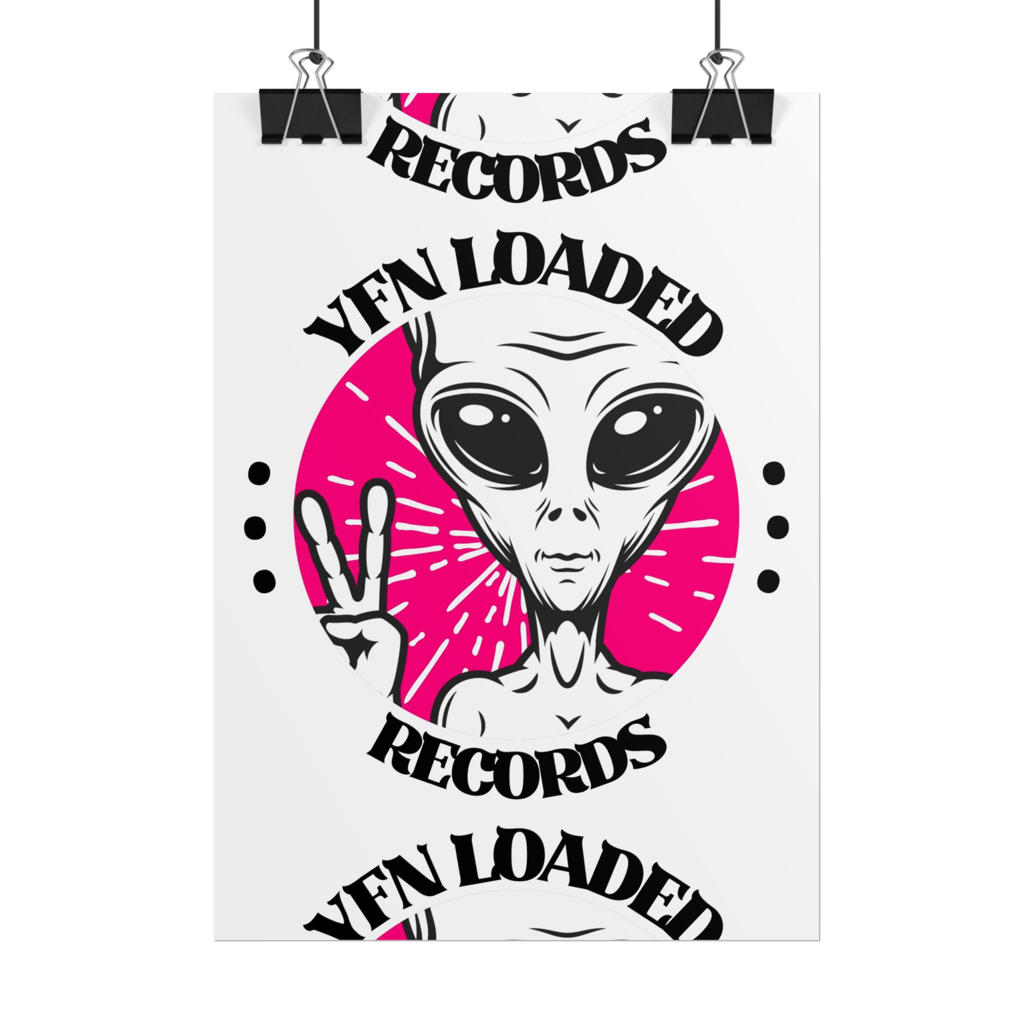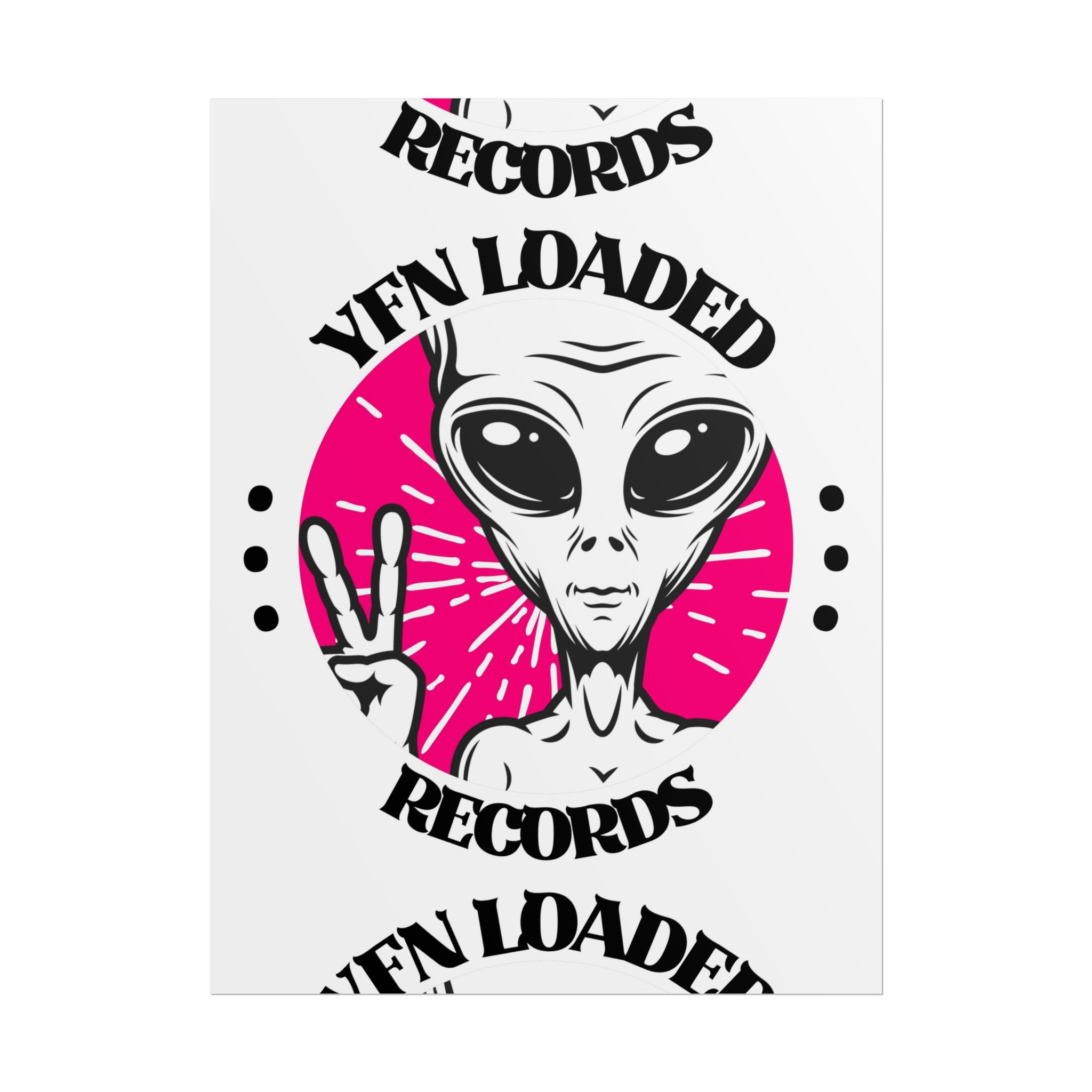 A bold rolled poster that brings playful extraterrestrial energy to any wall. Printed with archival giclée quality, this design features a stylized alien flashing a peace sign against a vivid magenta halo and retro type that reads “VFN LOADED RECORDS.” The textured fine art option adds depth and a handcrafted feel; semi-gloss delivers punchy, sharp color; matte offers a softer, museum-like finish. Rolled for safe shipping, these posters arrive ready to frame or pin up for instant personality in studios, dorm rooms, or listening corners.