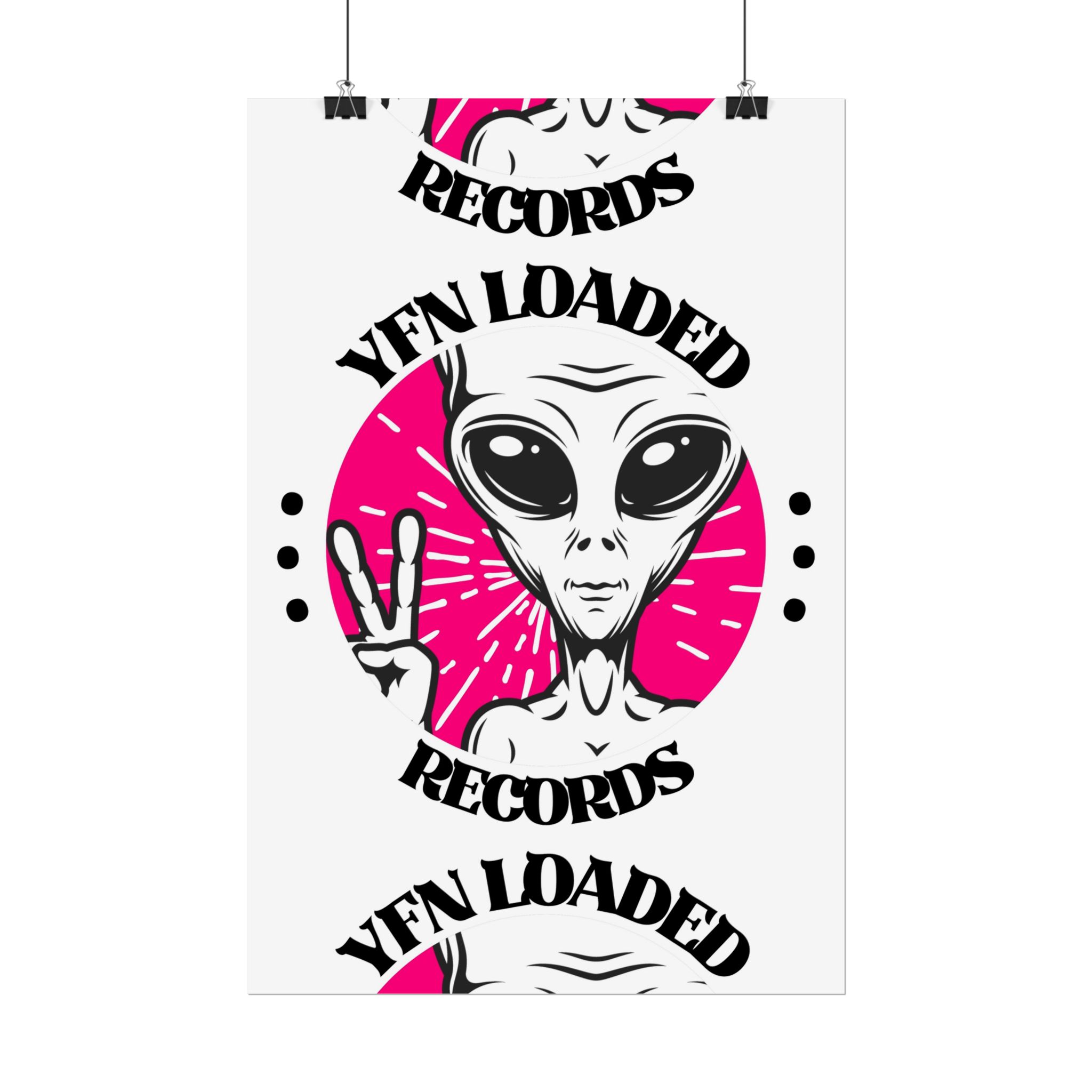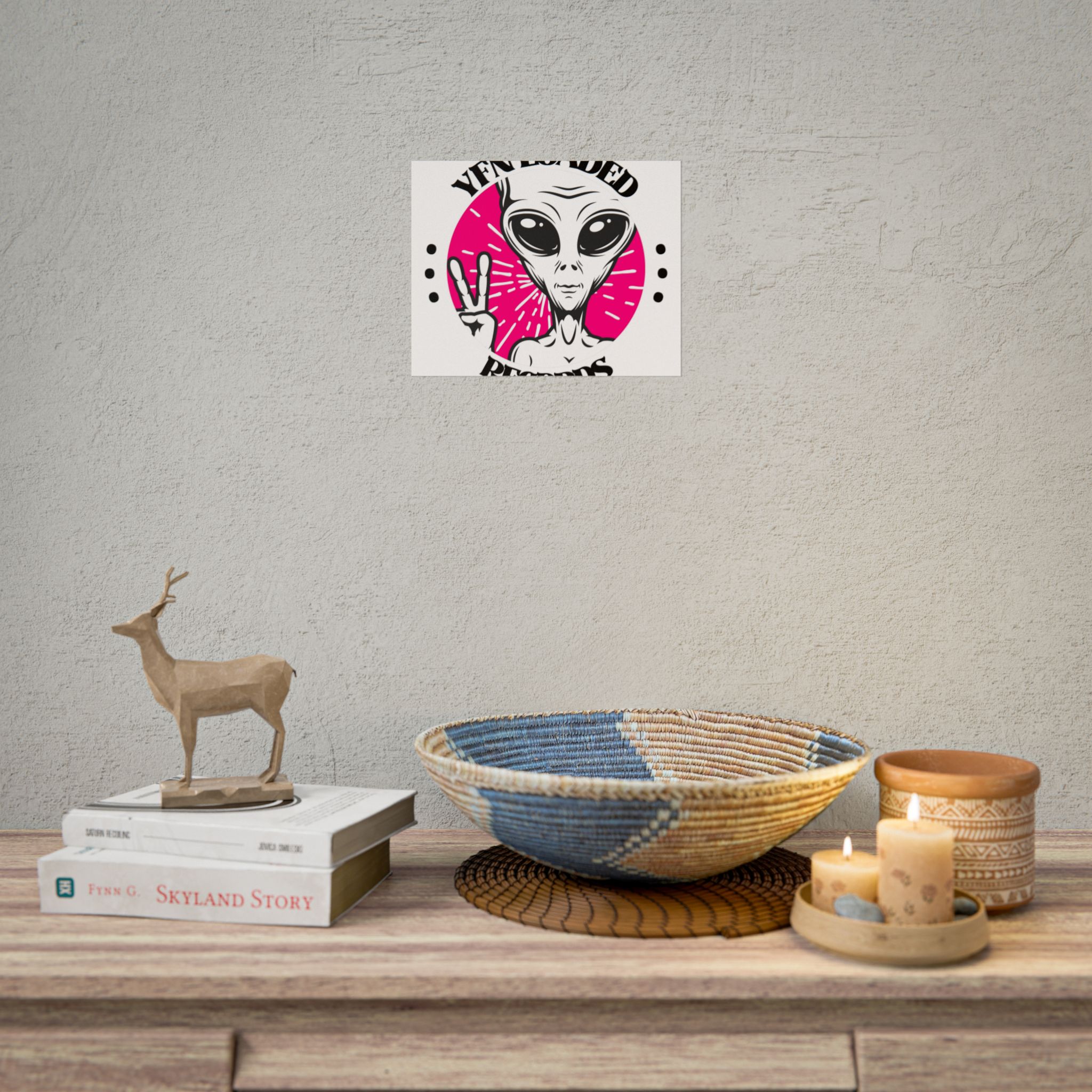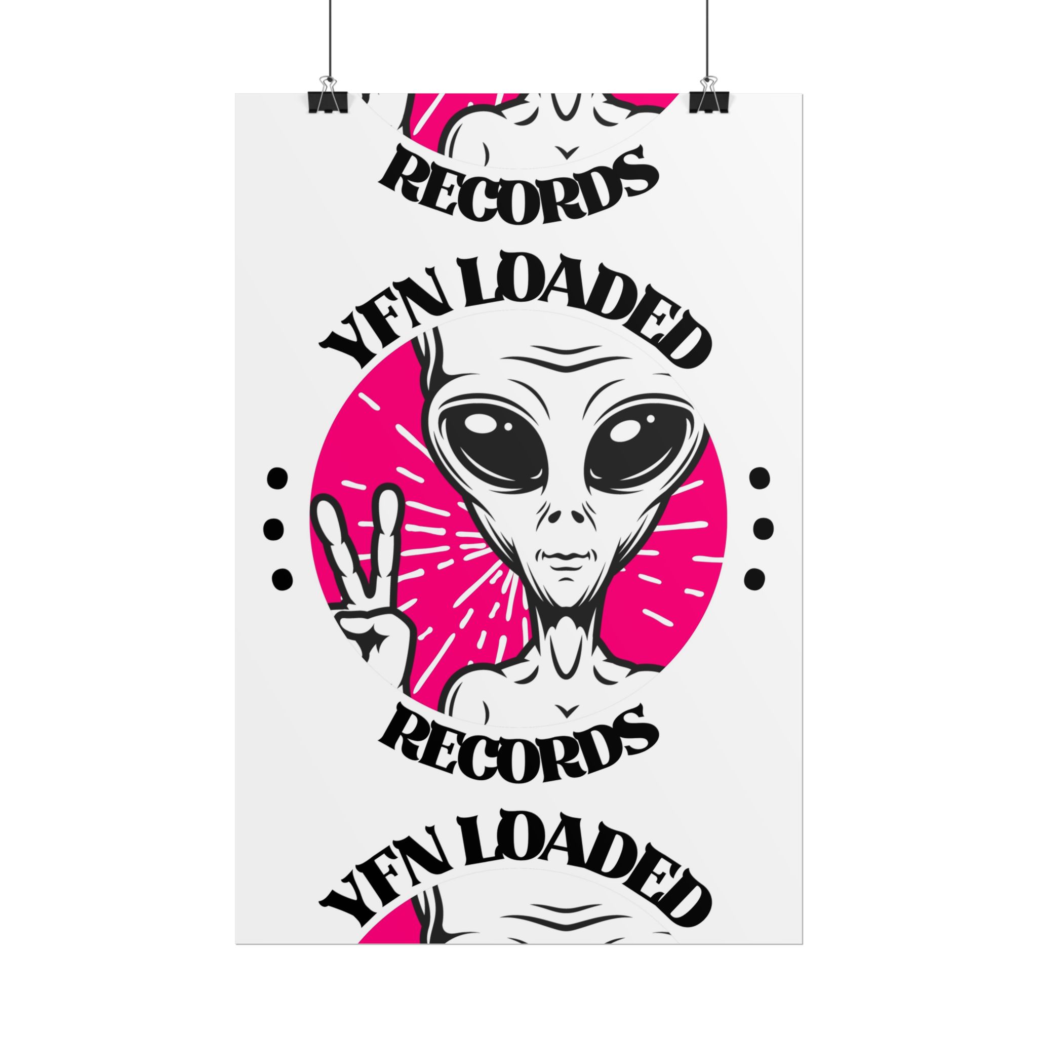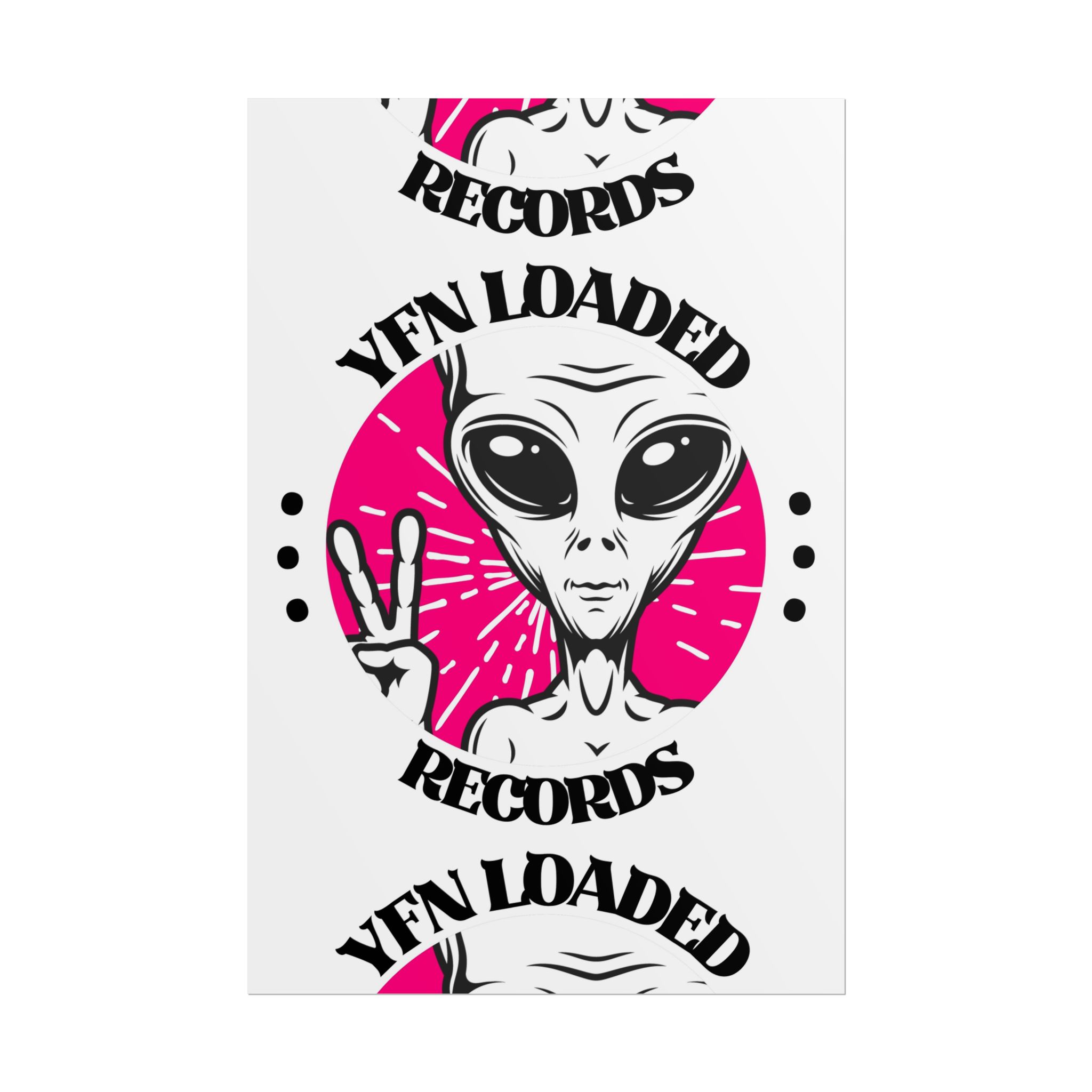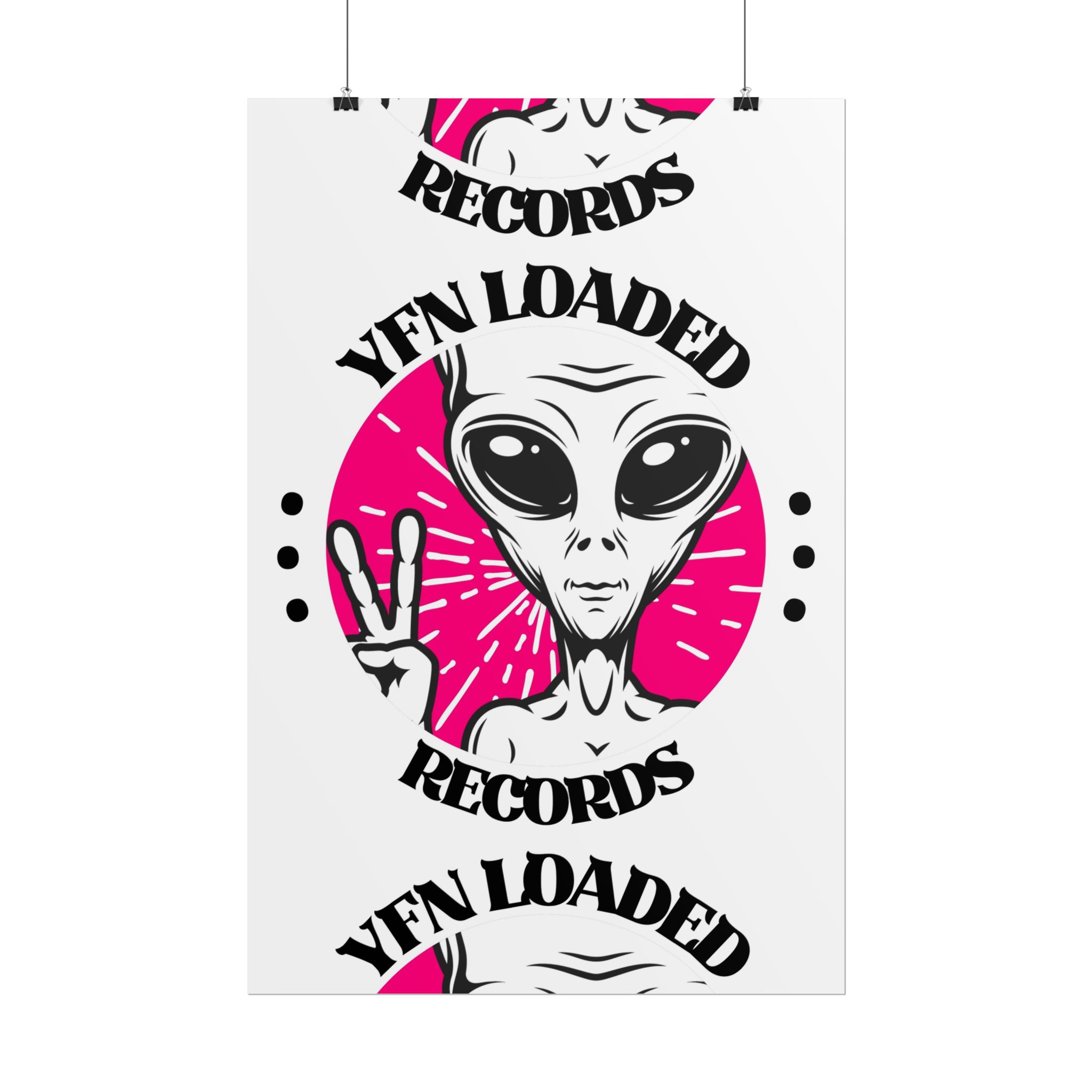 A bold rolled poster that brings playful extraterrestrial energy to any wall. Printed with archival giclée quality, this design features a stylized alien flashing a peace sign against a vivid magenta halo and retro type that reads “VFN LOADED RECORDS.” The textured fine art option adds depth and a handcrafted feel; semi-gloss delivers punchy, sharp color; matte offers a softer, museum-like finish. Rolled for safe shipping, these posters arrive ready to frame or pin up for instant personality in studios, dorm rooms, or listening corners.