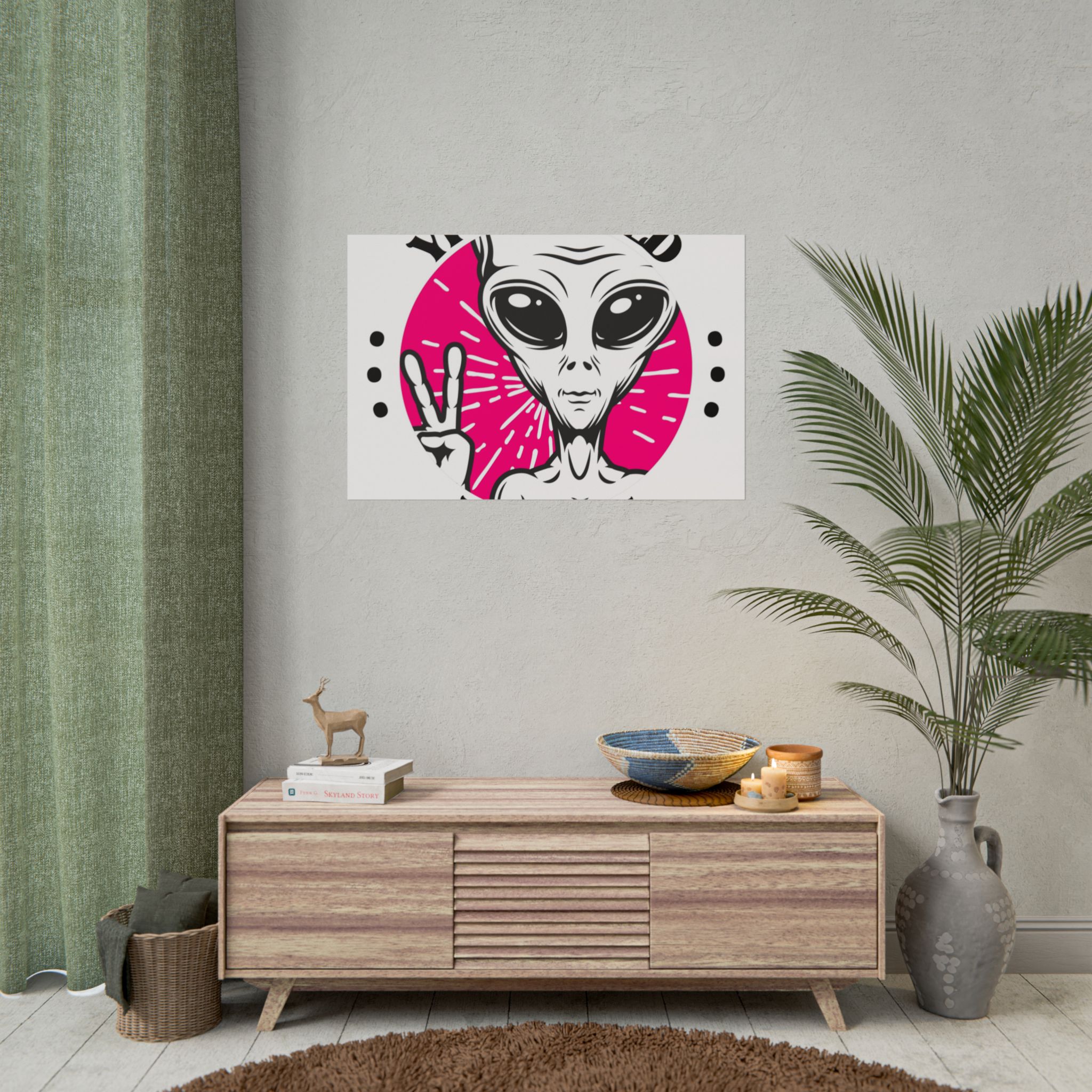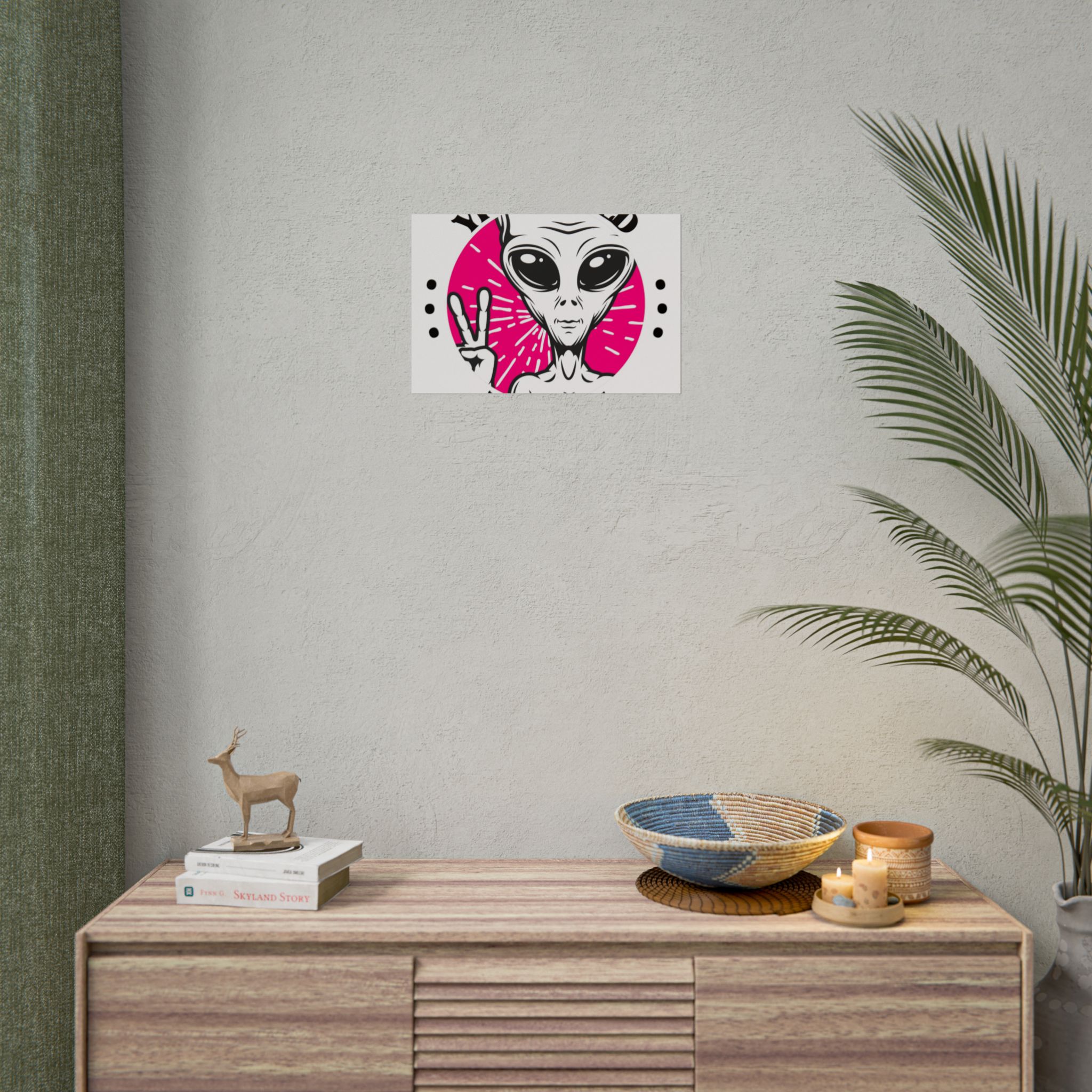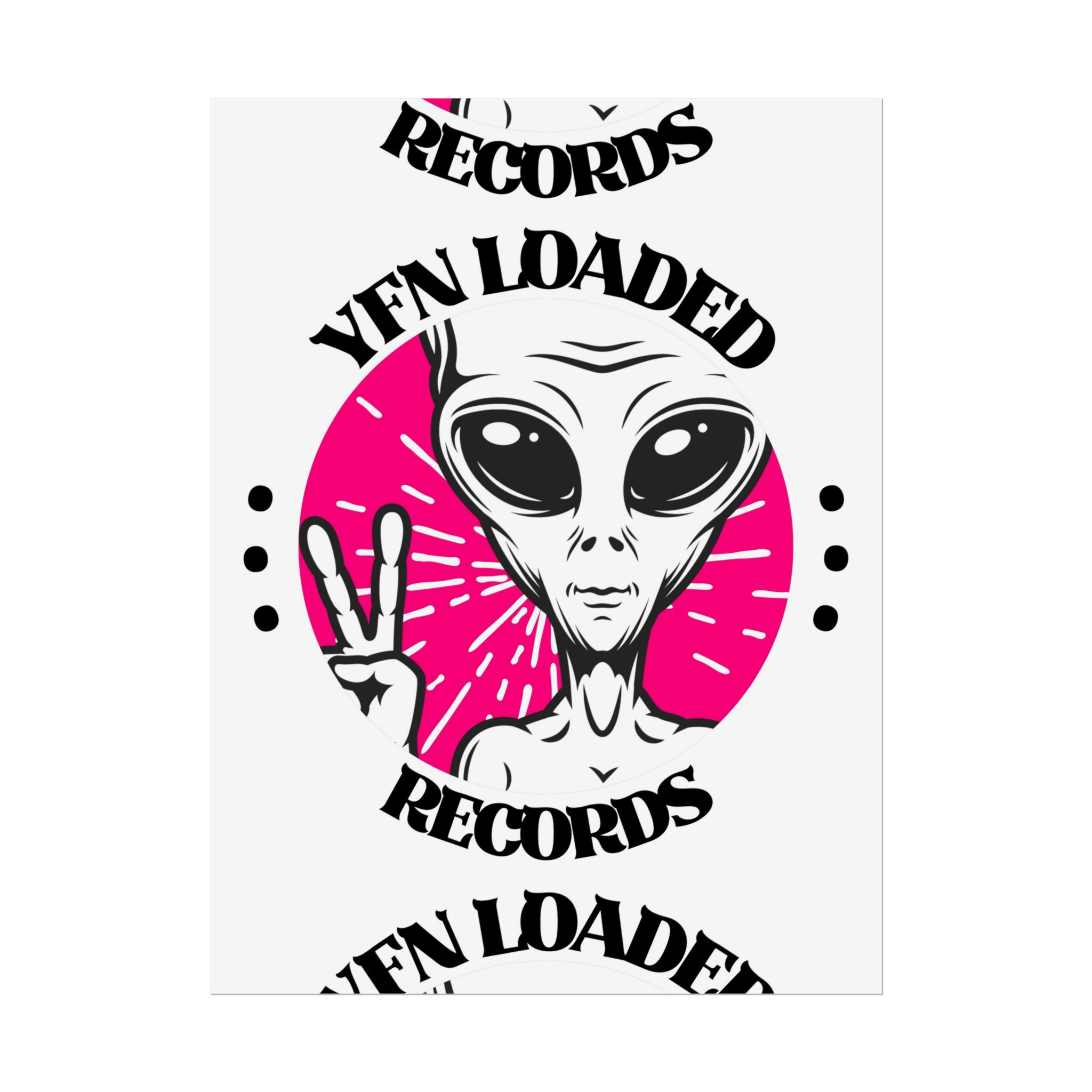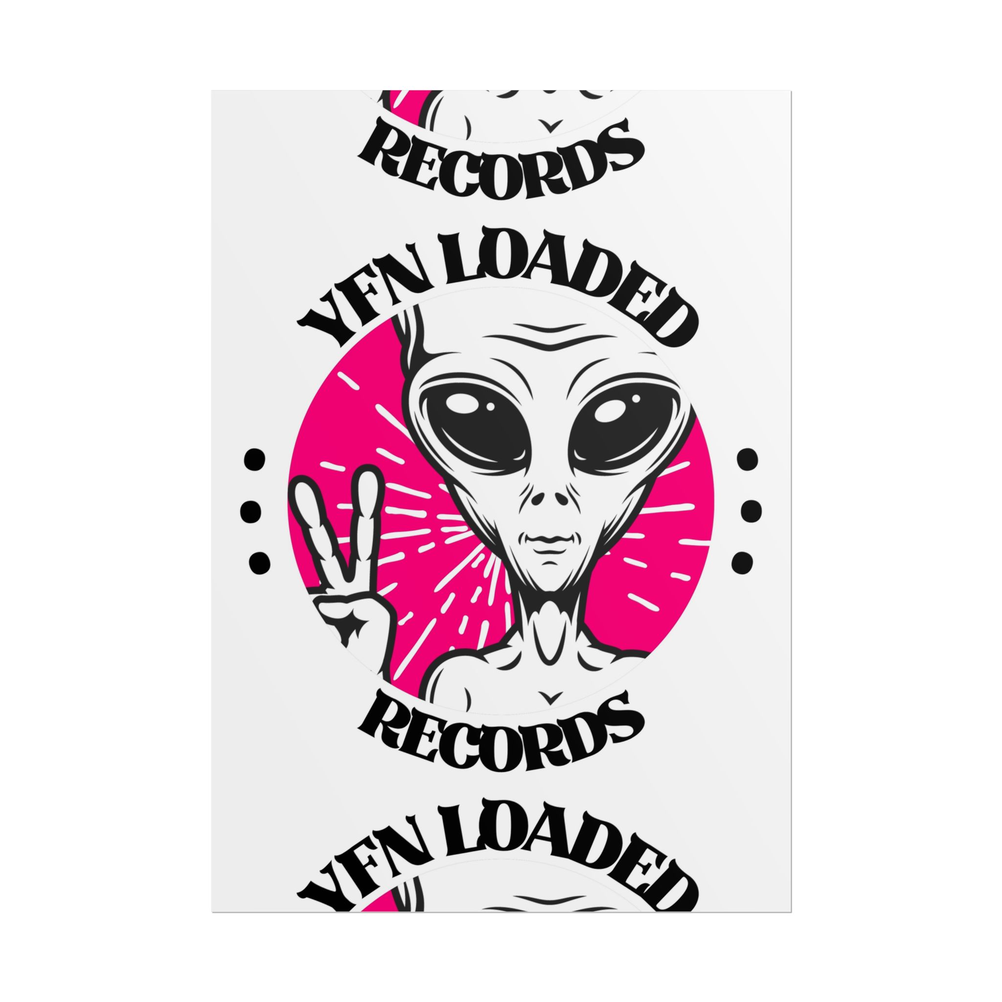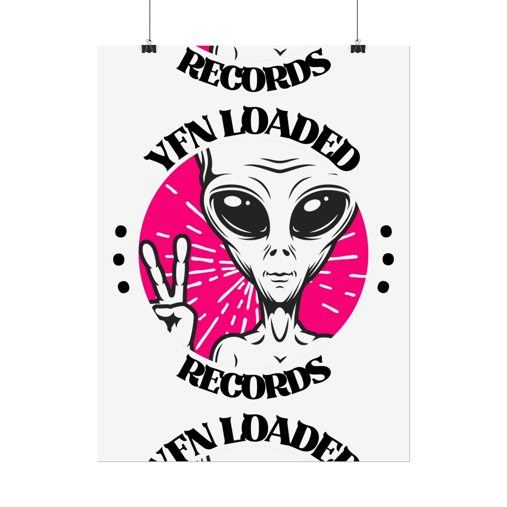 A bold rolled poster that brings playful extraterrestrial energy to any wall. Printed with archival giclée quality, this design features a stylized alien flashing a peace sign against a vivid magenta halo and retro type that reads “VFN LOADED RECORDS.” The textured fine art option adds depth and a handcrafted feel; semi-gloss delivers punchy, sharp color; matte offers a softer, museum-like finish. Rolled for safe shipping, these posters arrive ready to frame or pin up for instant personality in studios, dorm rooms, or listening corners.