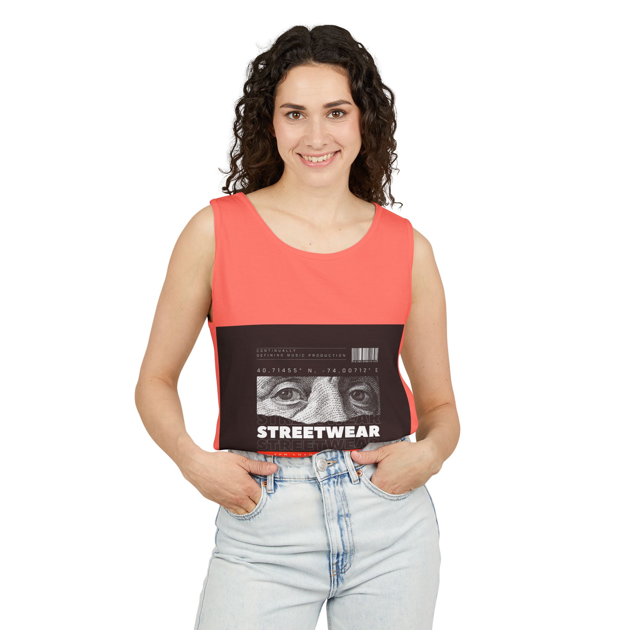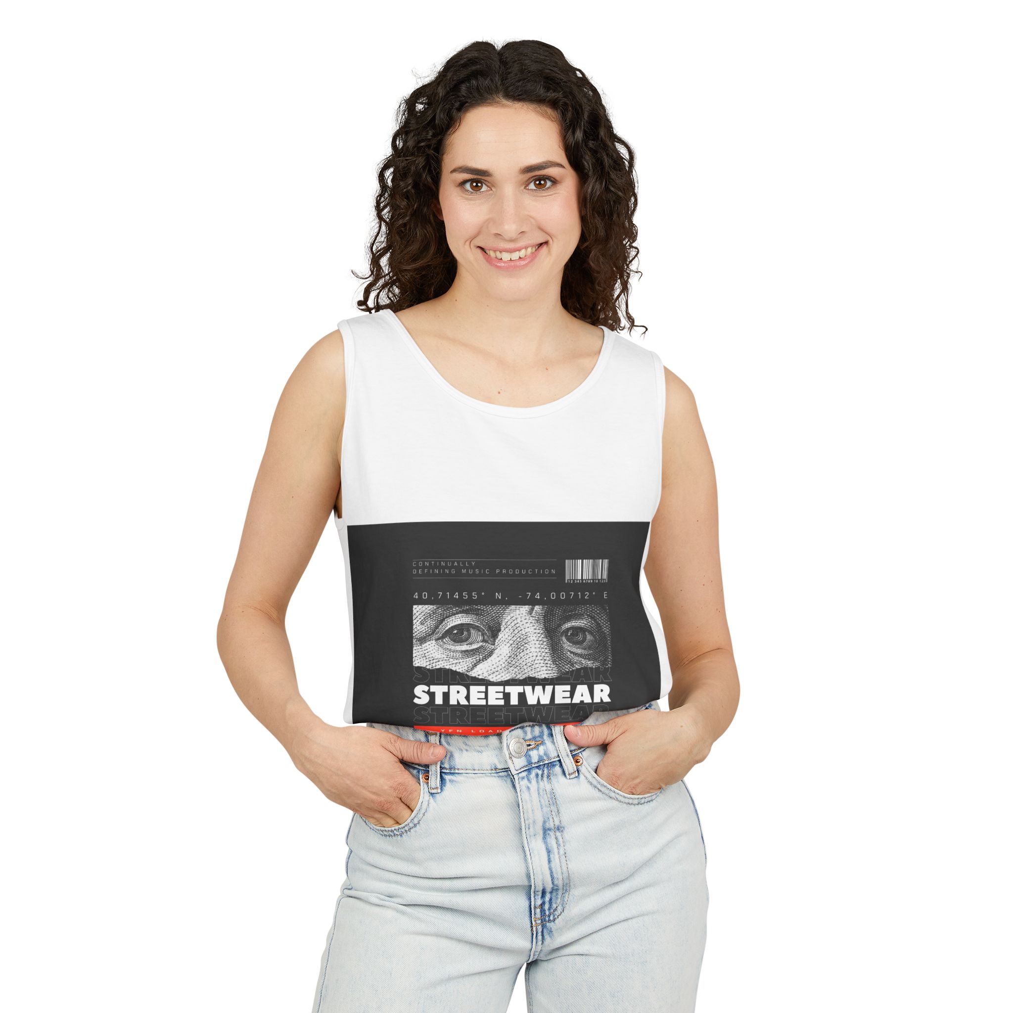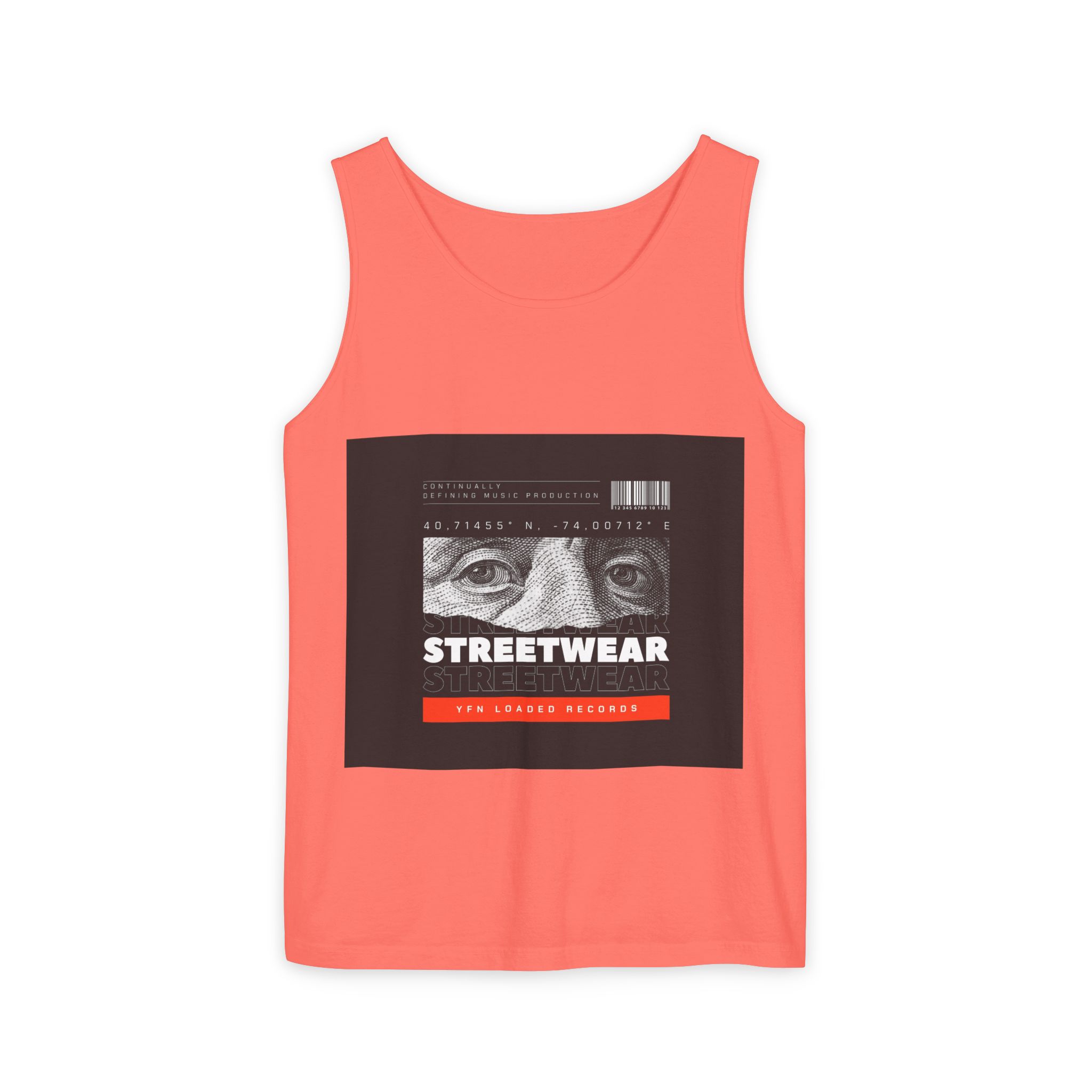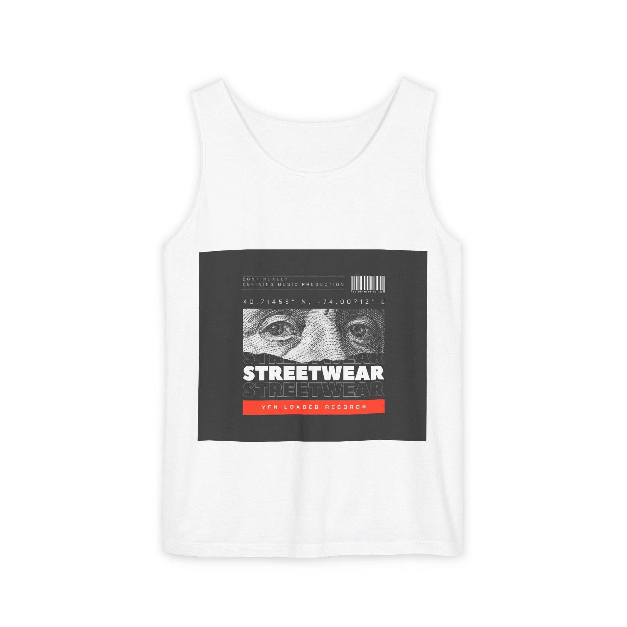 The feel is lived-in from the first wear: breathable medium-weight cotton with smooth, tight knit and clean self-fabric binding at the armholes and neck. Tubular construction keeps the sides clean and minimizes seams for a streamlined fit. Garment-dyeing gives the fabric a subtle, vintage tone and soft hand that complements the stark graphic. For people who move through the city intentionally—artists, skaters, and streetwear fans—this tank becomes part of the story you tell without saying much.