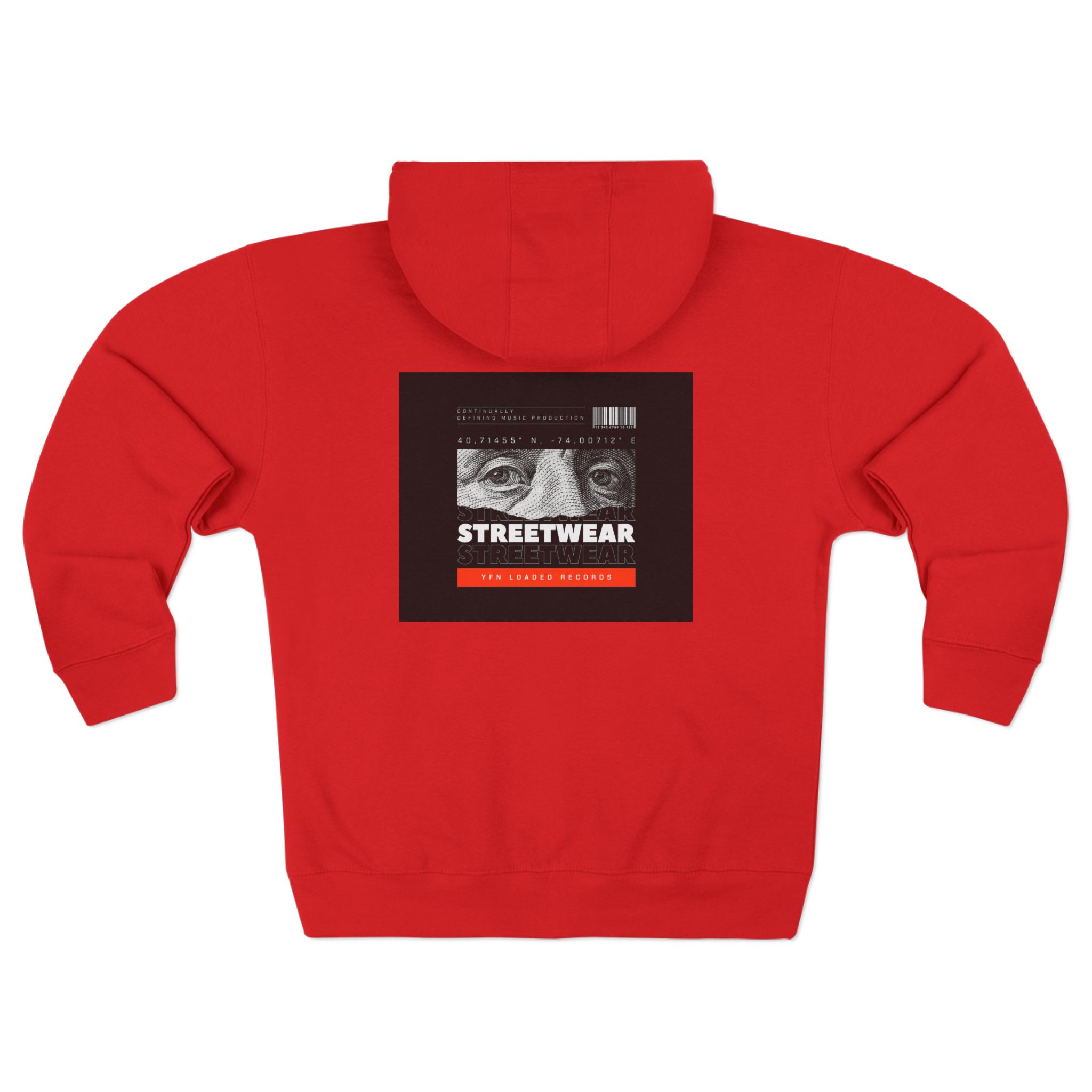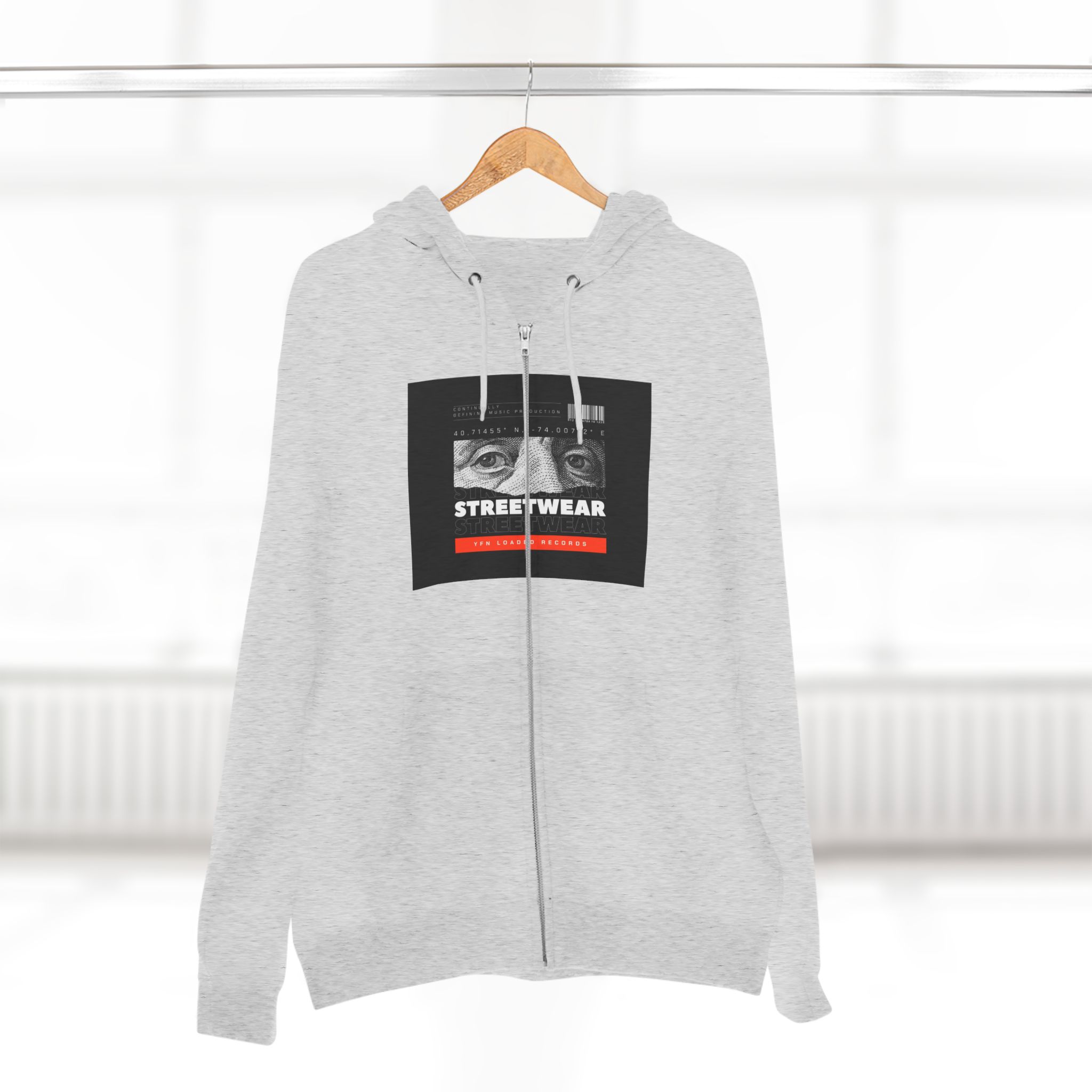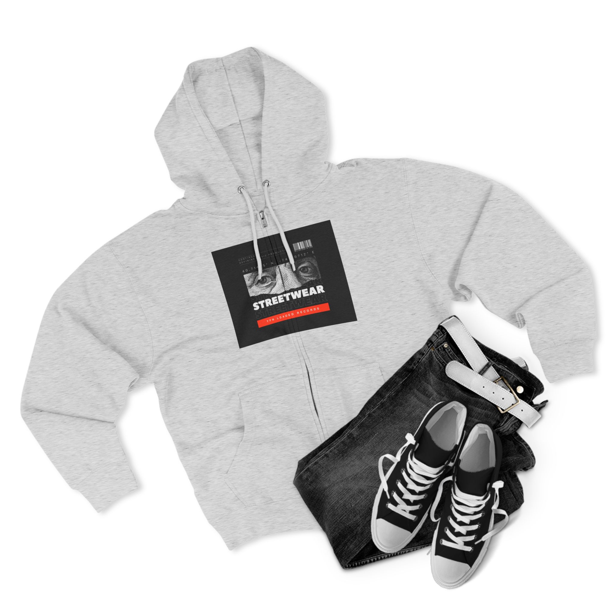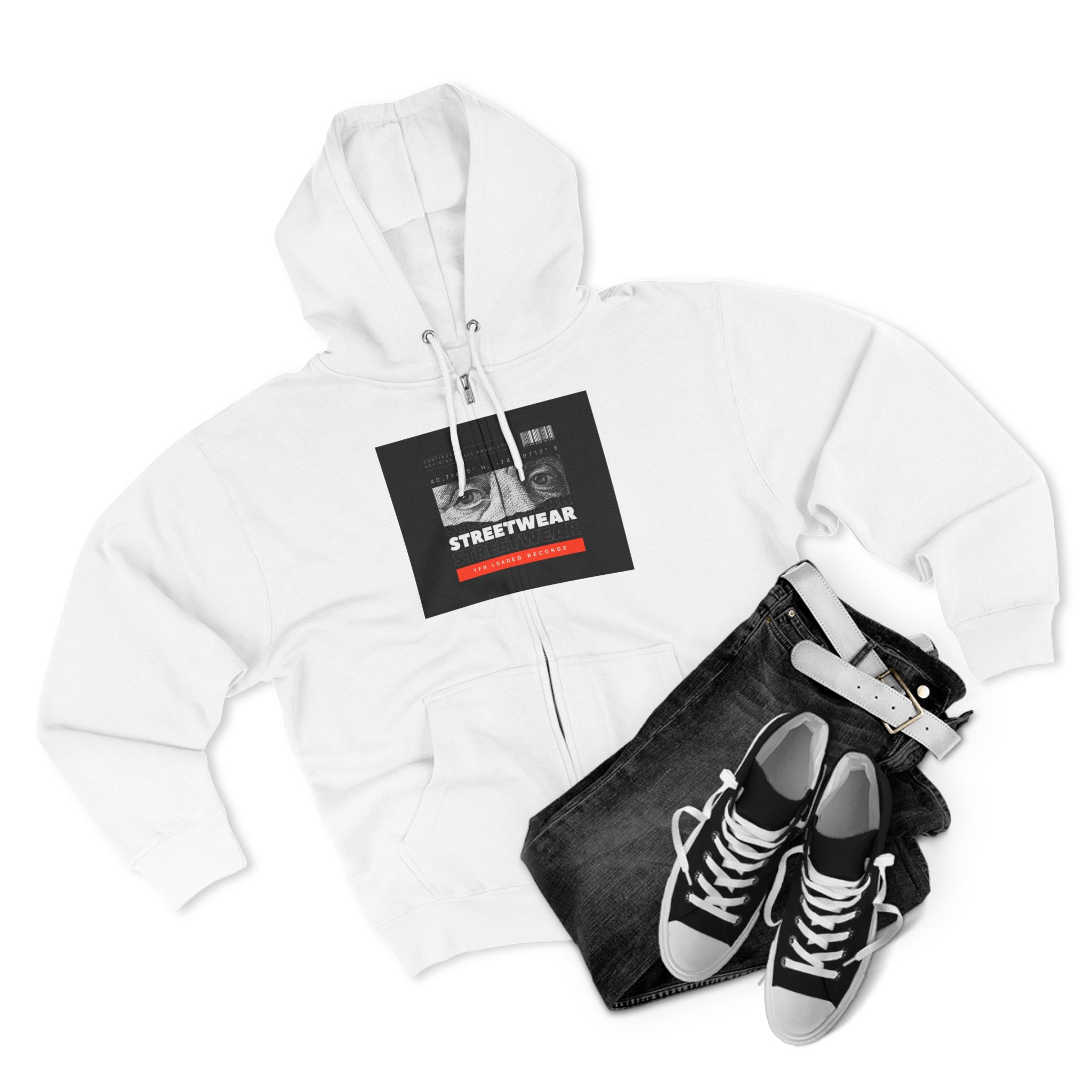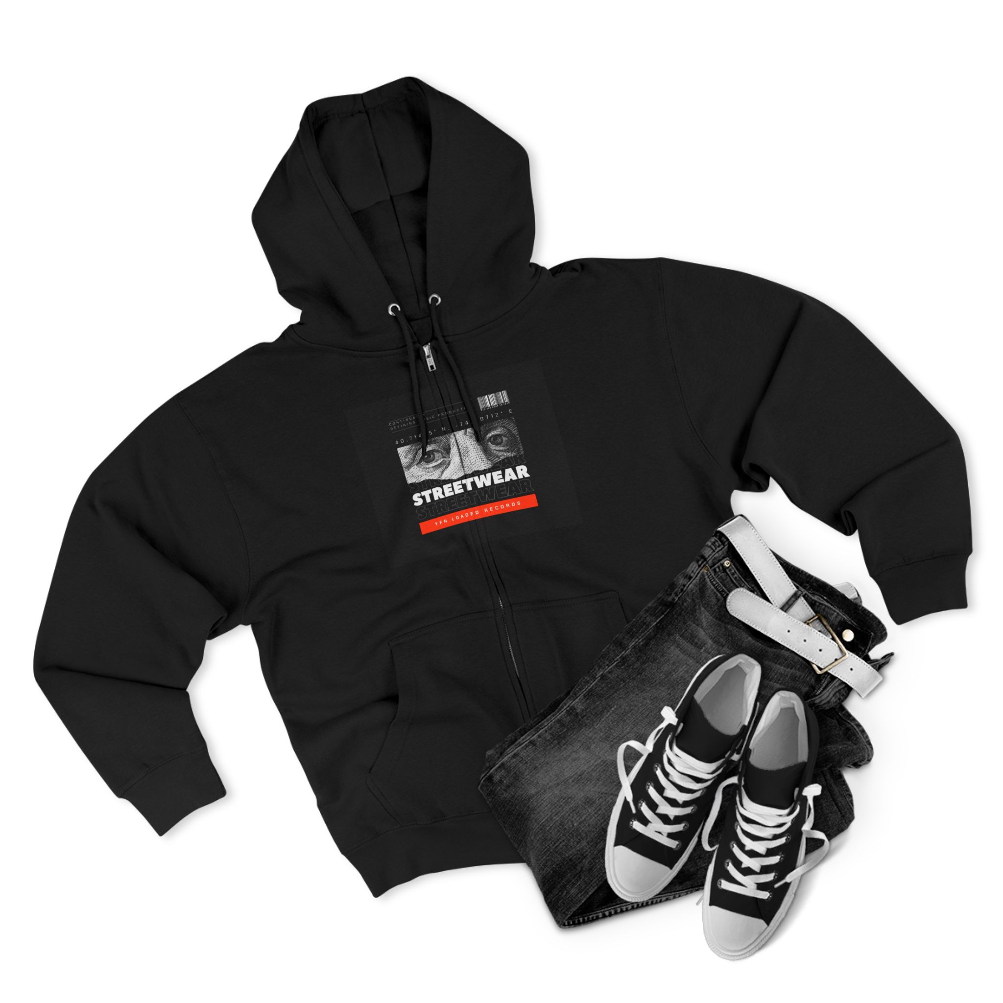 This zip-up hoodie brings a quiet, urban edge to everyday wear. The front and back show a bold, square streetwear graphic—close-up eyes in monochrome with a sharp red accent—so it reads like a statement piece without shouting. The soft, midweight fleece and three-panel hood make it comfortable for cool evenings walking city blocks, waiting for late-night transit, or hanging at a gallery opening. The roomy kangaroo pocket and reliable YKK zipper keep things practical, while the subtle tear-away label and neat necktape keep the fit feeling clean. Wear it layered over a tee or under a coat; it sits naturally in the rotation of someone who values comfort with a gritty, artful aesthetic.