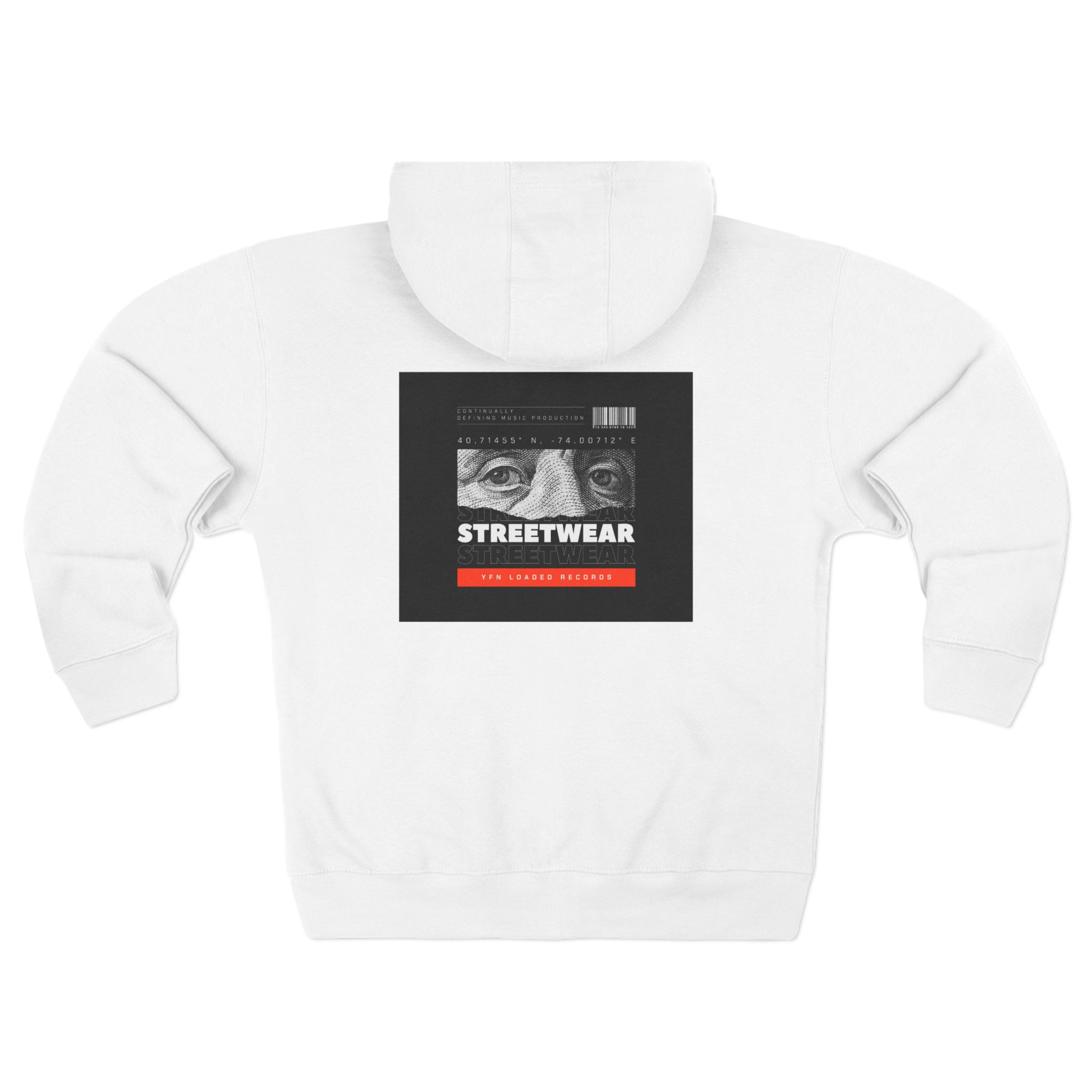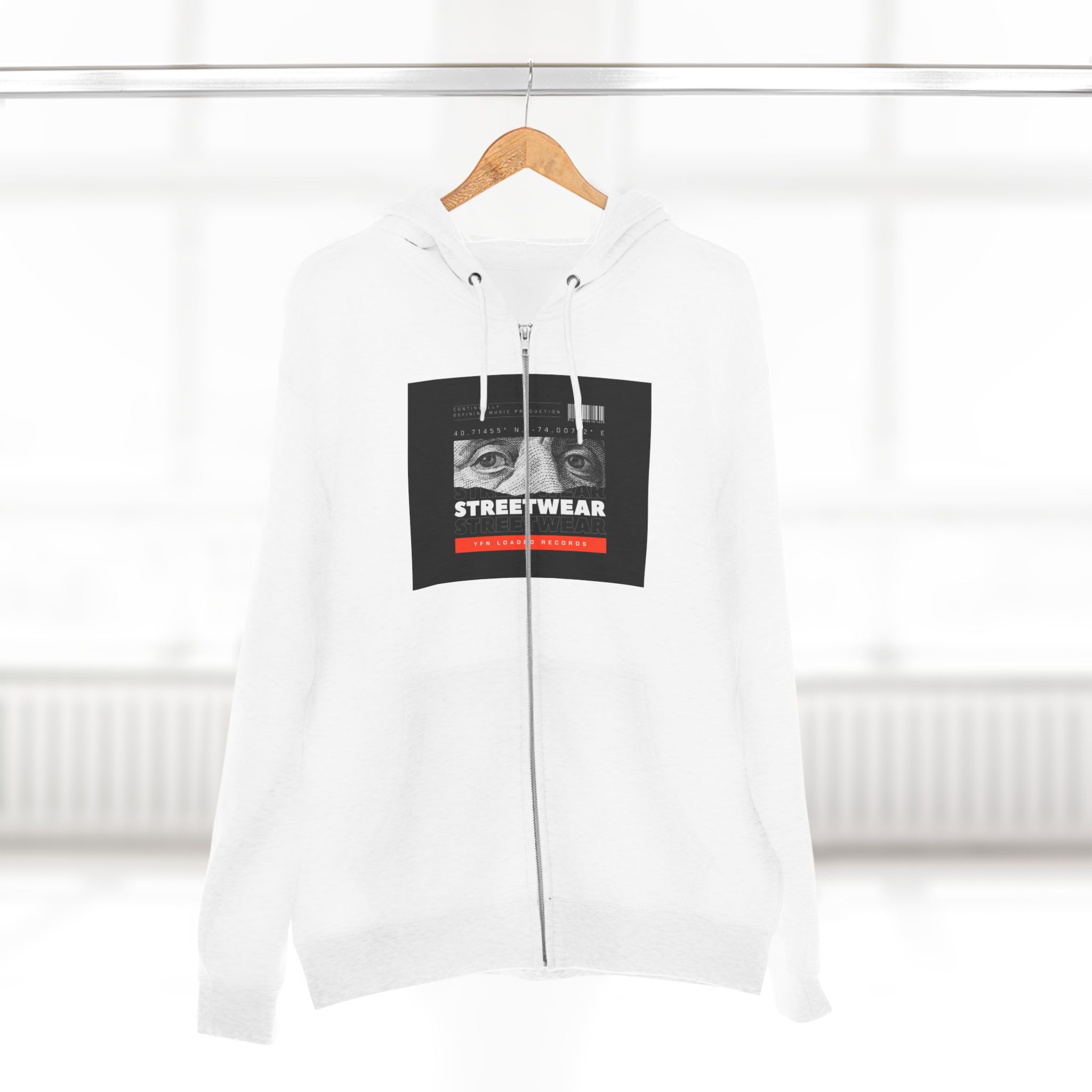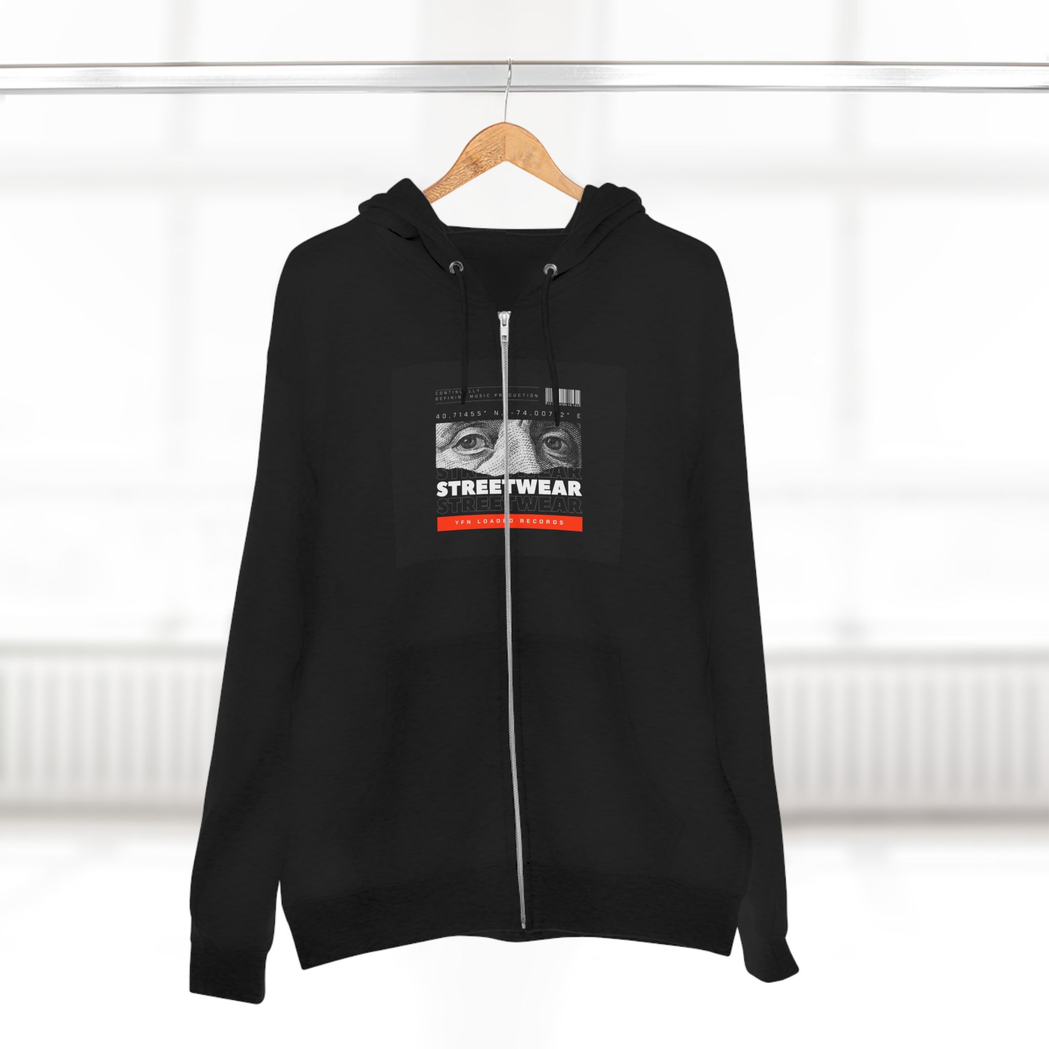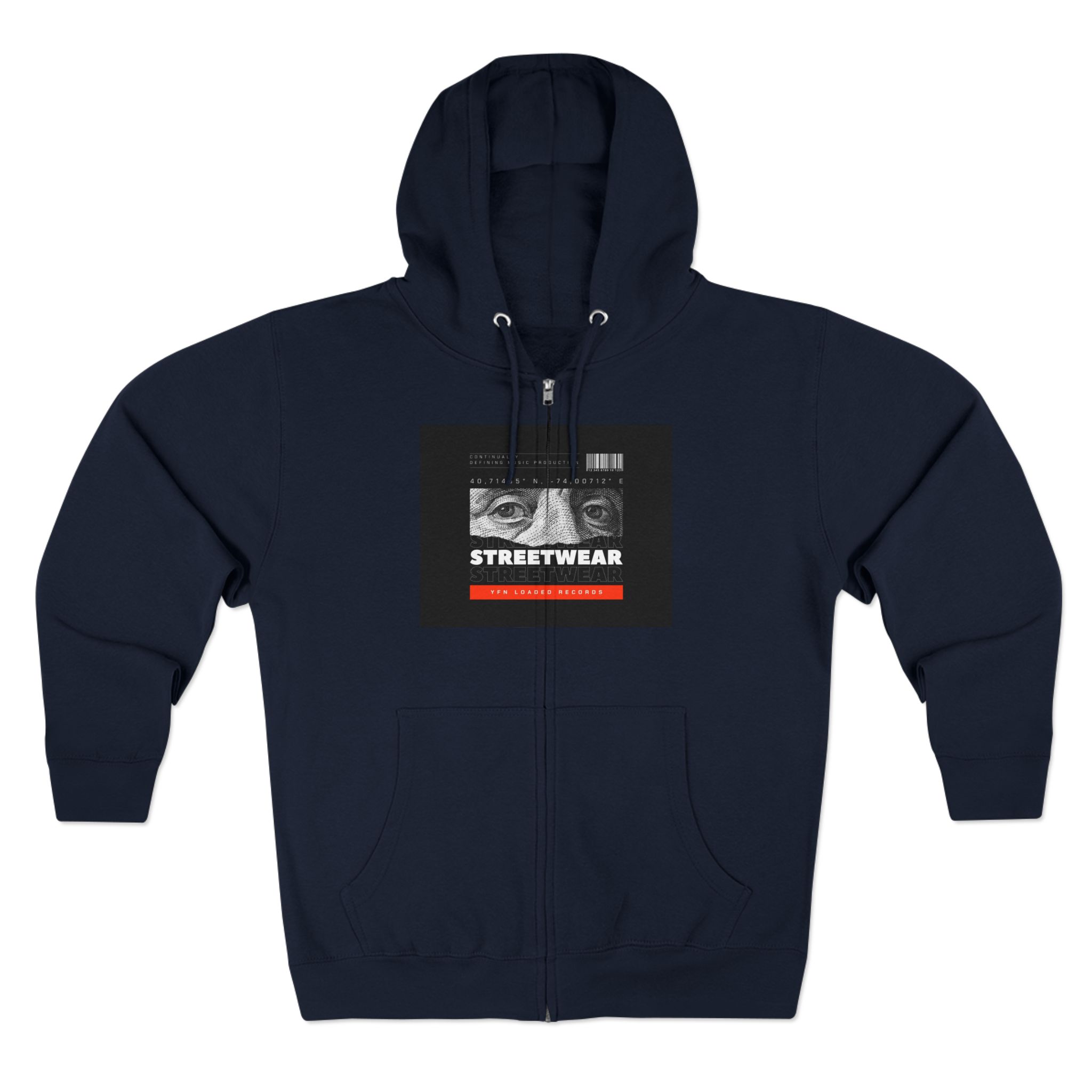 This zip-up hoodie brings a quiet, urban edge to everyday wear. The front and back show a bold, square streetwear graphic—close-up eyes in monochrome with a sharp red accent—so it reads like a statement piece without shouting. The soft, midweight fleece and three-panel hood make it comfortable for cool evenings walking city blocks, waiting for late-night transit, or hanging at a gallery opening. The roomy kangaroo pocket and reliable YKK zipper keep things practical, while the subtle tear-away label and neat necktape keep the fit feeling clean. Wear it layered over a tee or under a coat; it sits naturally in the rotation of someone who values comfort with a gritty, artful aesthetic.