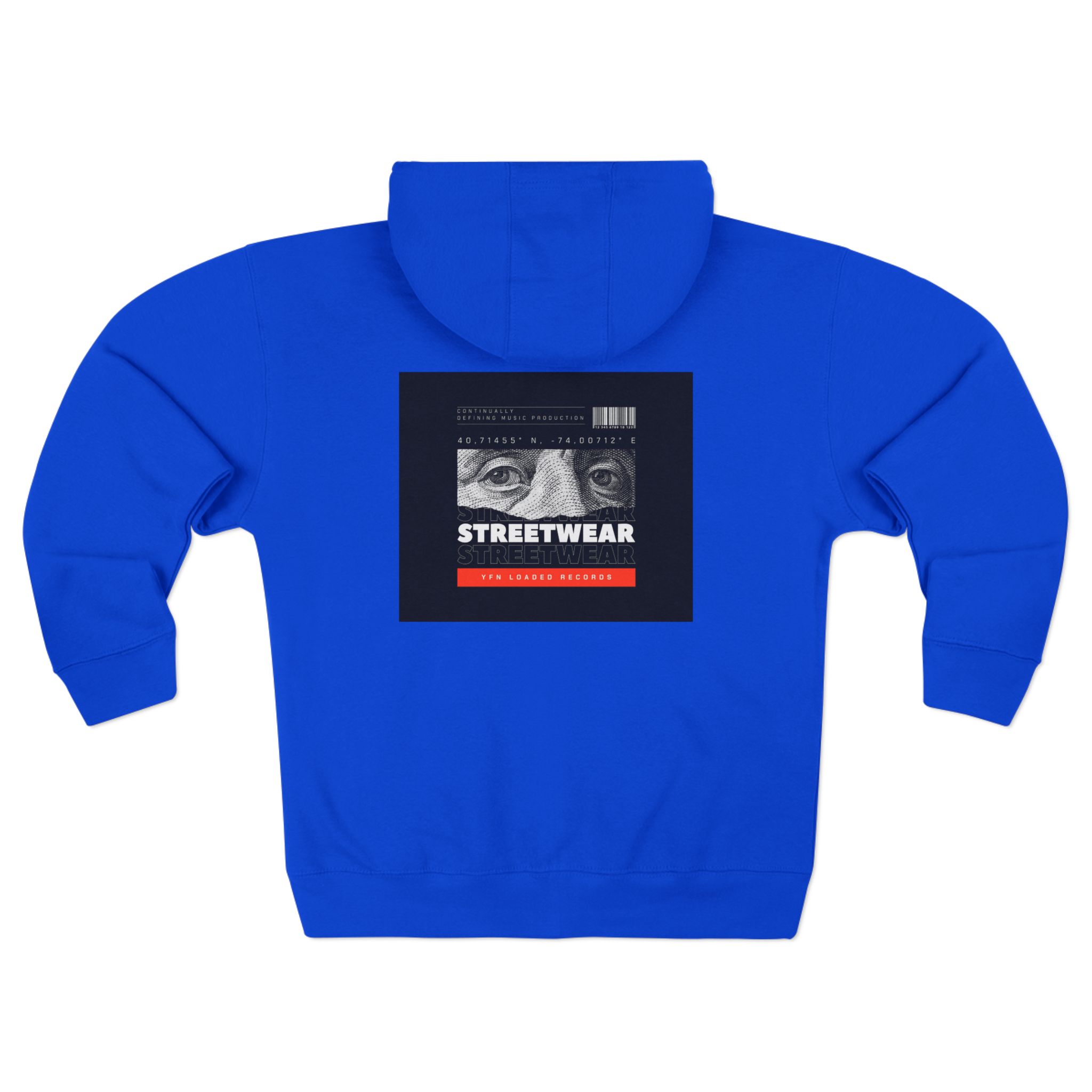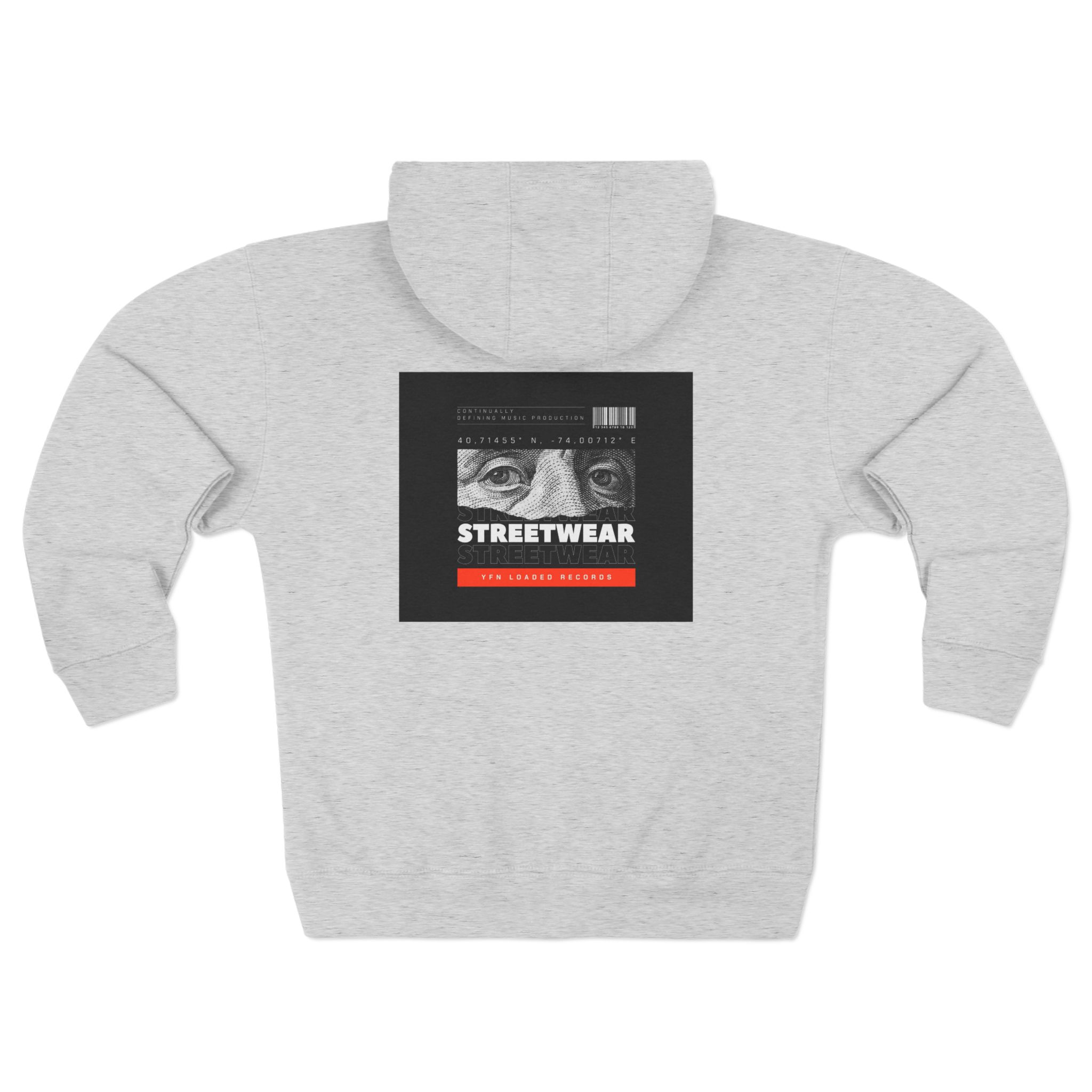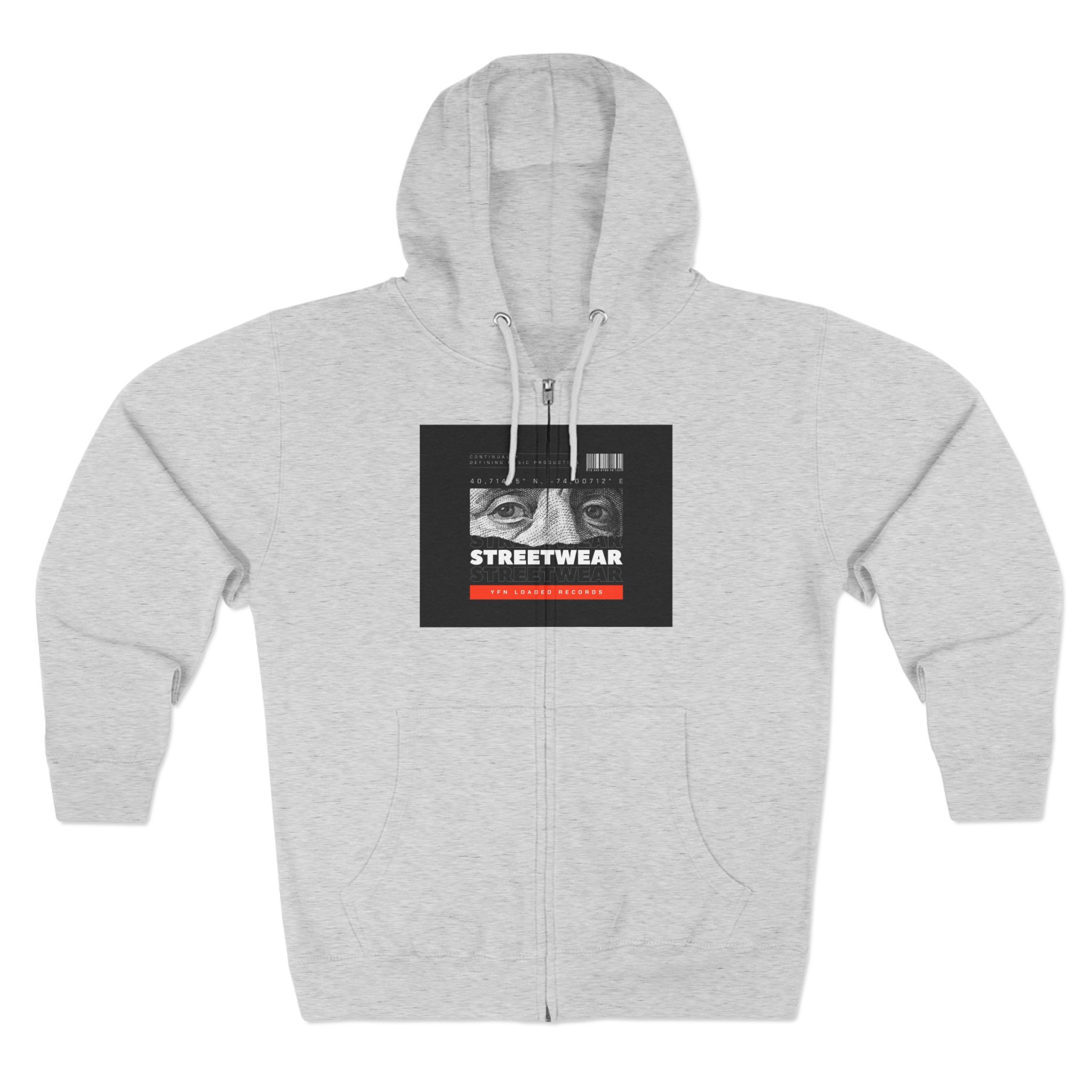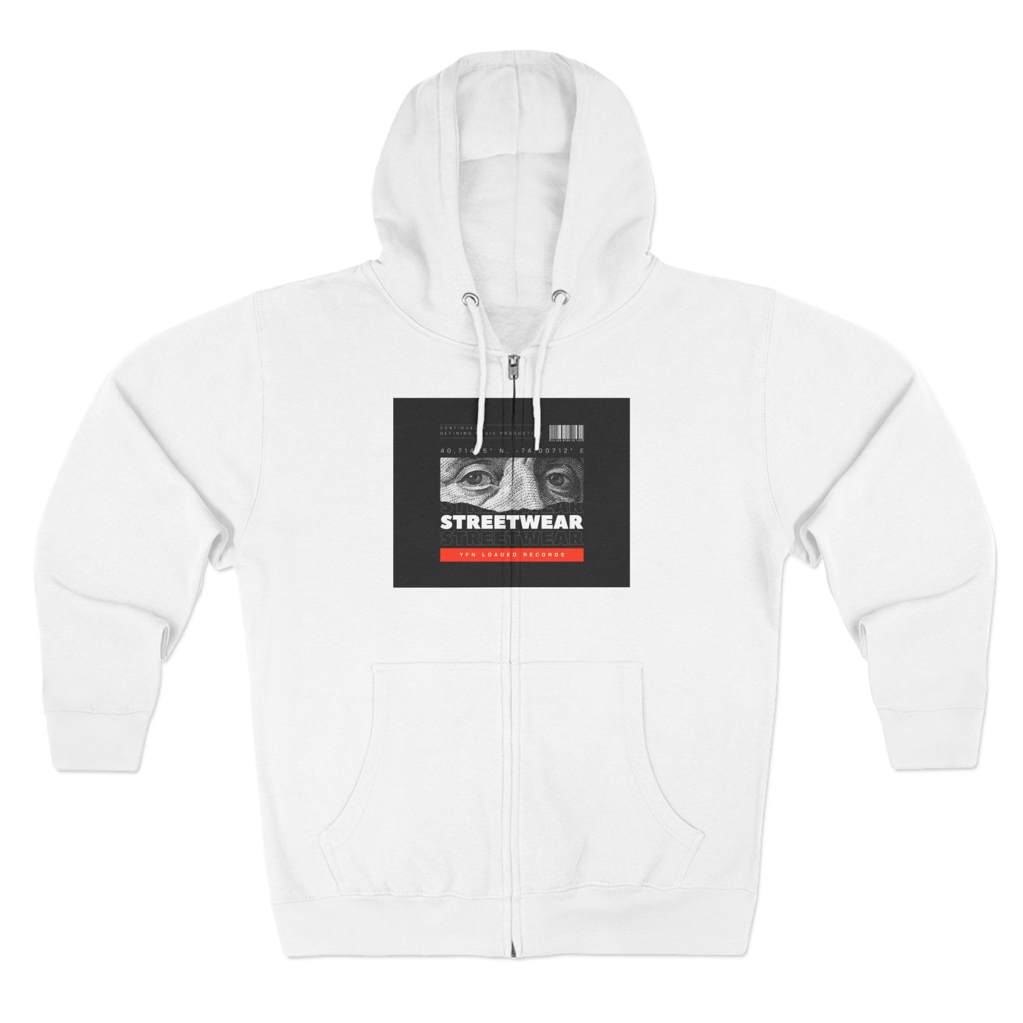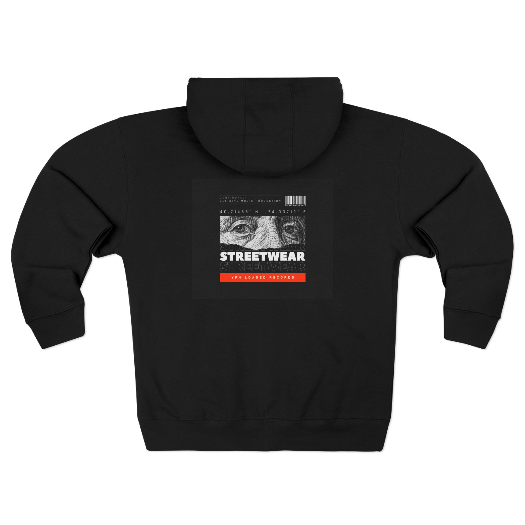 This zip-up hoodie brings a quiet, urban edge to everyday wear. The front and back show a bold, square streetwear graphic—close-up eyes in monochrome with a sharp red accent—so it reads like a statement piece without shouting. The soft, midweight fleece and three-panel hood make it comfortable for cool evenings walking city blocks, waiting for late-night transit, or hanging at a gallery opening. The roomy kangaroo pocket and reliable YKK zipper keep things practical, while the subtle tear-away label and neat necktape keep the fit feeling clean. Wear it layered over a tee or under a coat; it sits naturally in the rotation of someone who values comfort with a gritty, artful aesthetic.