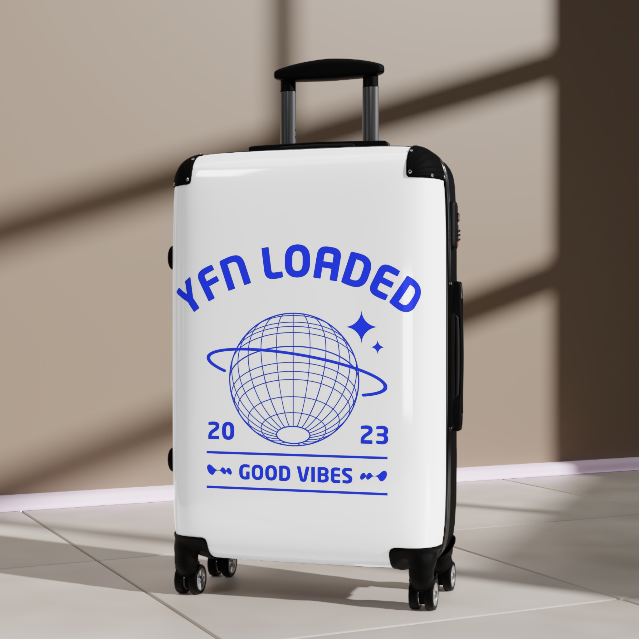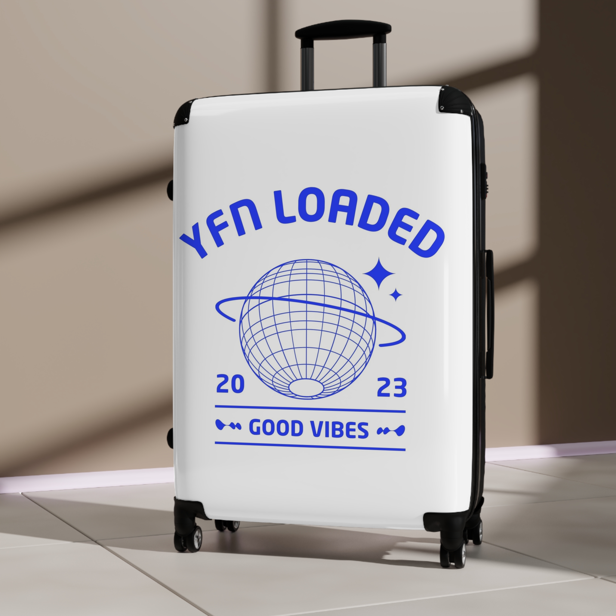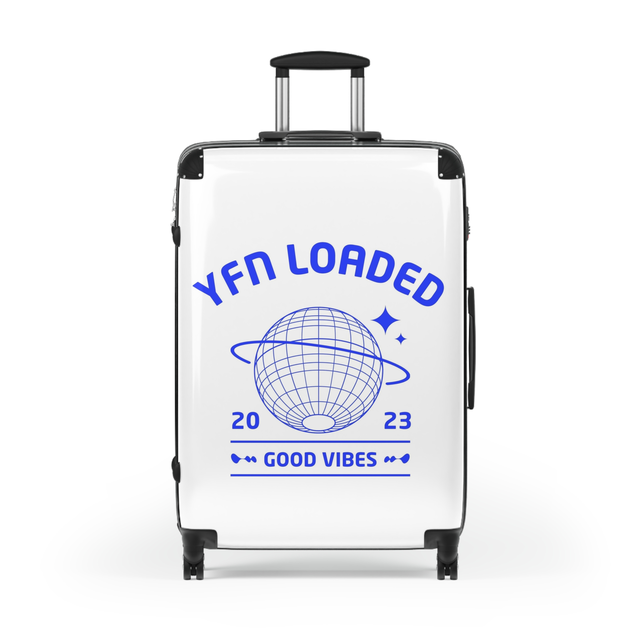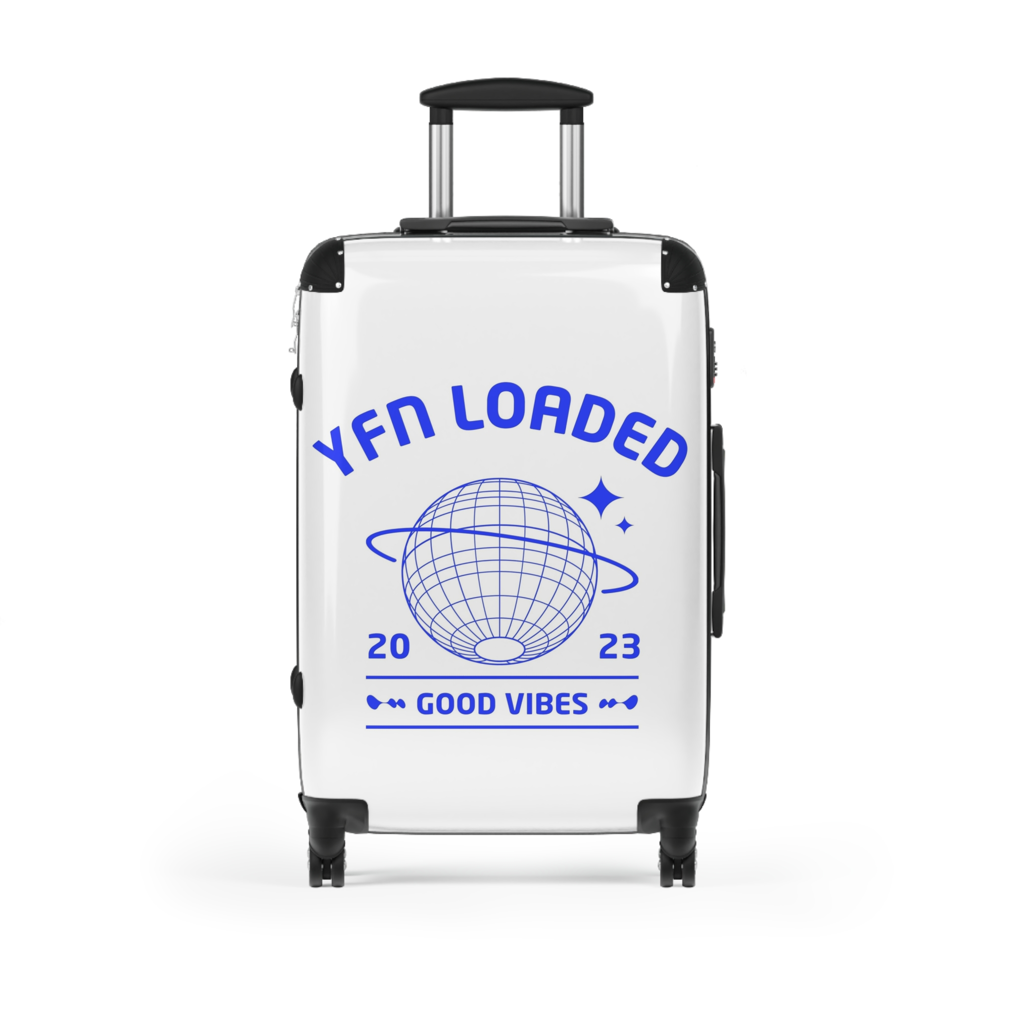 This hard-shell suitcase blends festival energy with reliable travel performance. A glossy polycarbonate front carries a bold, blue graphic of a ringed disco globe and the phrase “YFN LOADED — Good Vibes 2023,” while the sturdy black ABS back protects against knocks. Inside, organized packing is simple thanks to two inner pockets, a removable lined interior under a rubber seal, and the option for extended storage on the largest size. Smooth 360° double wheels and an adjustable telescopic handle make airport sprints effortless, and the built-in lock adds everyday security. Bright printing ensures the vibrant design stays crisp trip after trip — for travelers who want their luggage to stand out and tell a story.