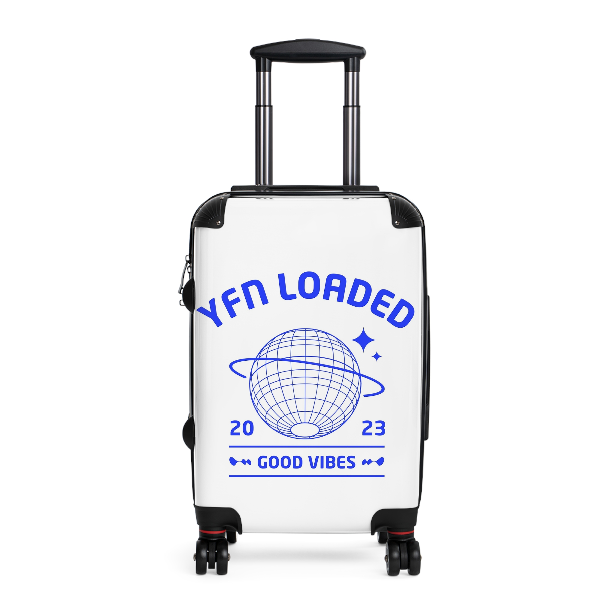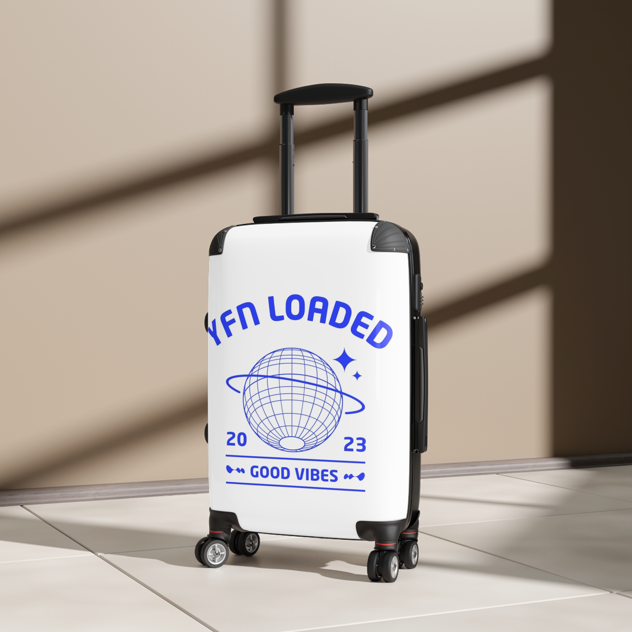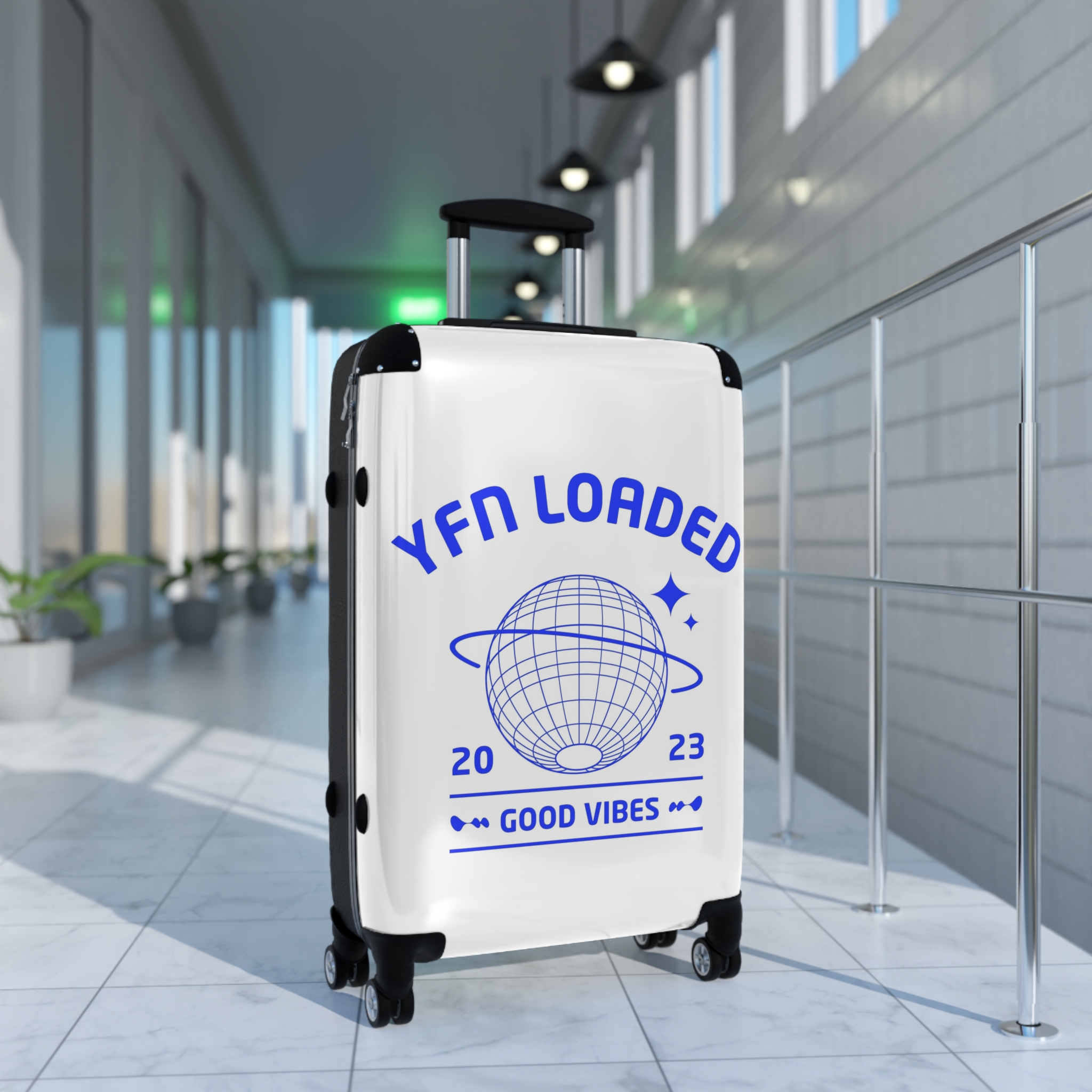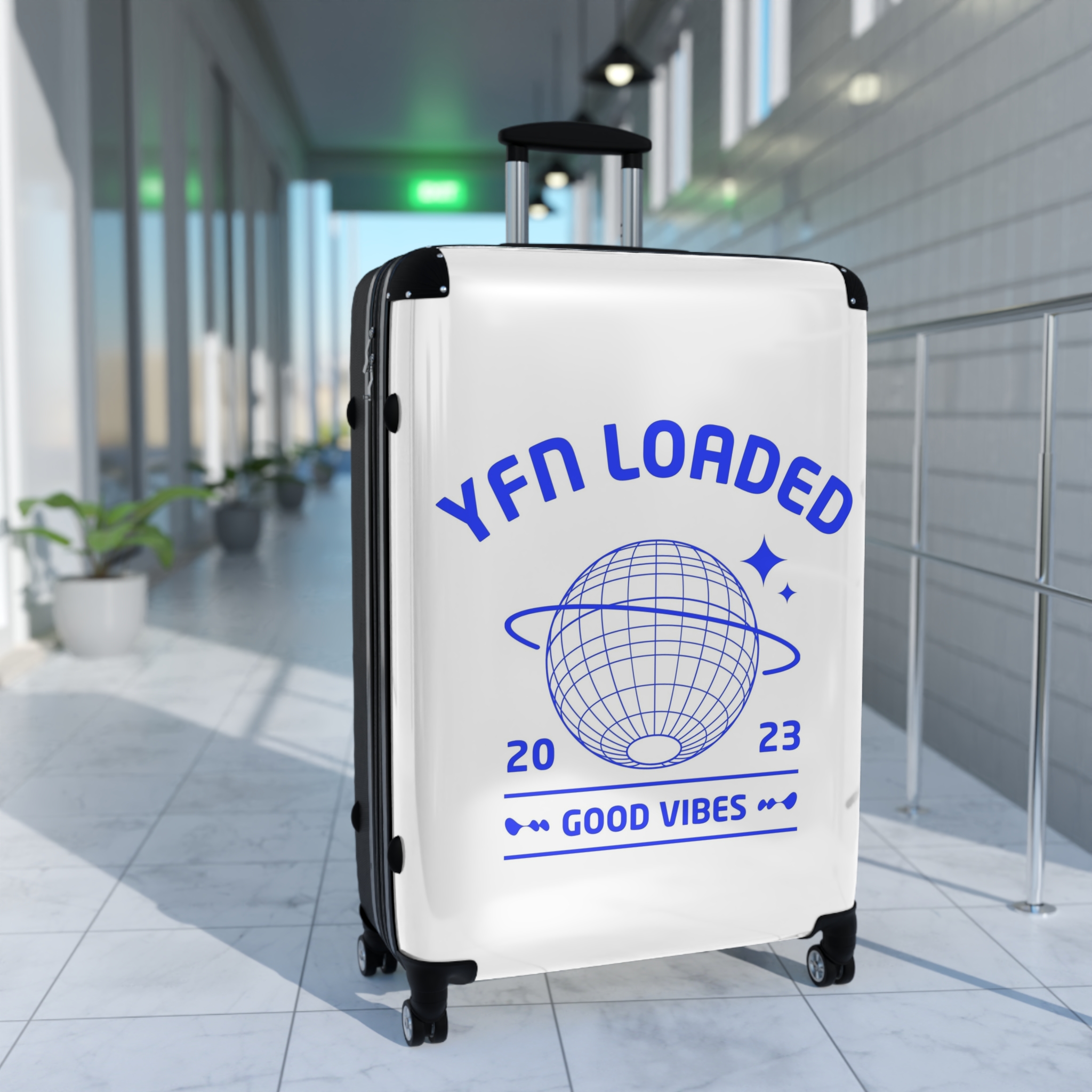 This hard-shell suitcase blends festival energy with reliable travel performance. A glossy polycarbonate front carries a bold, blue graphic of a ringed disco globe and the phrase “YFN LOADED — Good Vibes 2023,” while the sturdy black ABS back protects against knocks. Inside, organized packing is simple thanks to two inner pockets, a removable lined interior under a rubber seal, and the option for extended storage on the largest size. Smooth 360° double wheels and an adjustable telescopic handle make airport sprints effortless, and the built-in lock adds everyday security. Bright printing ensures the vibrant design stays crisp trip after trip — for travelers who want their luggage to stand out and tell a story.